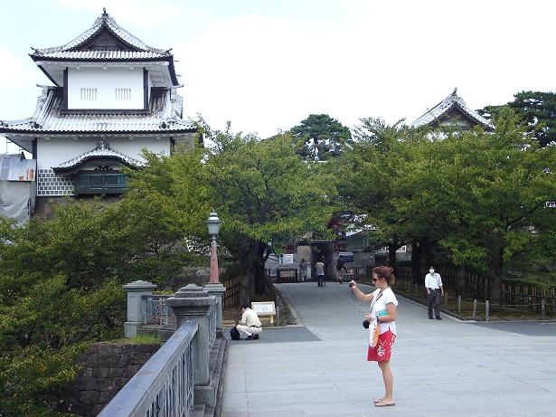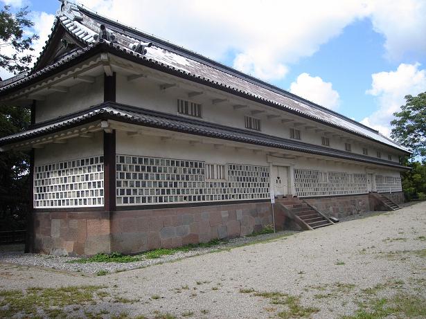 金沢散歩(6) 金沢城公園1 2015年2月1日更新金沢城は、兼六園のお隣に有ります。天正11(1583)年、前田利家が金沢城に入ってすぐ建設されました。しかしたびたび火災が有り、宝暦9(1759)年の火災で城のほとんどを焼失。その後再建されましたが、明治14(1881)年の火災で再び焼失。菱櫓・五十間長屋・橋爪門続櫓などは平成13年に復元した建物です。有名な石川門、三十間長屋、鶴丸倉庫のみ明治の火災を逃れこんにちに至っています。金沢城の見どころの一つは石垣。修復を何回も繰り返したため、様々な種類の石垣が有り、金沢城は「石垣の博物館」と呼ばれています。ありし日の城を行き交う人々に思いをはせながら、金沢城の石垣めぐりをするのも素敵です。入場は五十間長屋を除いて無料。金沢駅東口からバスで20分くらい。まちバス(土日祝日のみ運行)、兼六園シャトル(毎日運行)なら土日祝日は100円で来られます。写真がたくさん有りますので2回に分けてご紹介します。次回は主に石垣に焦点を当てる予定です。[石川門]天明8(1788)年に建設された古い建物です。このアングルの写真は有名ですね。金沢を紹介するときにたいてい使われます。春、桜の咲く時期は見事な風景となります。[案内所]石川門をくぐり抜けるとすぐ見えてきます。 [案内所横の休憩室][休憩室から見える五十間長屋]平成13年に復元された建物です。建物左端を「橋爪門続櫓」、右端を「菱櫓」、中央の長い部分は「五十間長屋」と言い、お城の見張りと武器倉庫の役目が有ったそうです。広場では小学生が遠足のようですね。 [休憩室から見える河北門二の門]平成22年復元完成の建物です。[河北門一の門]お城への入口の一つ。くぐり抜けると上の河北門二の門に出て、お城へ入れます。これも平成22年復元完成。[河北門一の門]上の河北門一の門の正面です。[五十間長屋 裏手]五十間長屋は、裏手(二の丸広場)へ回ると中に入ることができます。有料310円。右に見える建物が料金所です。料金が安いので中に入ってみることにしました。[五十間長屋内部]何もかも新品ですが、当時の作り方を再現してあるそうです。[出窓の石落とし]ここから石を落として敵を撃退しようとしたのでしょう。[出土品展示コーナー][出土品展示コーナー][菱櫓最上階からの景色]なかなか急な怖い階段を3階まで上がってゆくと狭い部屋に着きます。そこからの景色です。次回は金沢城公園2をご紹介しますね。ではまた。[金沢城公園2へ]☆☆☆ 金沢の旅館 ホテル ご紹介☆☆☆ [金沢駅周辺] [金沢繁華街]・[中心街]・[中心をやや離れた宿]☆ホームでは、石川県全域のお宿をご紹介しています。どうぞきまっし石川→ホームへ戻る