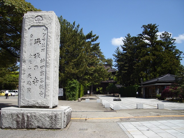 金沢散歩(18) 小立野 曹洞宗 天徳院 2015年2月26日更新天徳院は、加賀藩三代藩主前田利常(としつね)が、妻珠姫(たまひめ)を弔うために建てたお寺です。珠姫は第二代将軍徳川秀忠の次女。---加賀藩一代藩主前田利家亡き後、前田家はかなりの力を持っていたため、徳川家を討つという噂が流れました。徳川家は驚いて前田家を迎え撃とうと軍勢を集めました。加賀藩二代藩主利長(としなが)は急いで国家老を派遣して徳川家に歯向かう意思がないことを伝え、その証として利長の母、お松の方を人質として江戸へ差し出し、代わりに珠姫を我が子利常の嫁として迎えることにしたのです。珠姫はわずか3歳で金沢へ輿入れし、14歳で利常の妻となりました。3男5女を育てましたが、1622年、24歳の若さで亡くなってしまったのです。翌年、利常は珠姫のため、小立野台地の広大な敷地にお寺を建て、その翌年、徳川家康公が崇敬していた巨山泉滴(こさんせんてき)和尚を千葉県より招き開山しました。寺名は珠姫が亡くなった時の法名です[天徳院殿乾運淳貞大禅定尼]。---拝観料は、説明、からくり人形珠姫物語等を含め大人500円、中学生300円、小学生200円。境内、回廊散策は無料。静かで古色蒼然とした庭や回廊など見て回るのも見どころが有ります。また付近は小立野寺院群と言われ、お寺がたくさんあります。そちらもついでに散策するのもいいですね。金沢駅からバスで20分くらいです。[天徳院 正面]駐車場は広いので車で来られても大丈夫。[出世地蔵]入口近くに有ります。出世できるといいですね。[山門 県指定文化財]堂々として立派です。[山門 左の仁王様]相変わらず怖いお顔で魔を見張っています。[山門 右の仁王様]魔の心を持った人は入ることができません。[広い庭]四季折々の花が見られます。[本堂]禅寺だけに質素な感じがします。[本堂右に有る井戸と古びたポンプ]今は使われていないでしょう。[水かけ金洗い弁財天]山門を右へ入った長い回廊の途中にあります。ここでお金を洗ってお祈りするとお金が増えるそうです。1万円札を洗いたいところですが、お札は無理でしょう。こっそり回廊へ入るのは無料です。[烏蒭沙摩明王(うすさまみょうおう)]山門を左に入った長い回廊の途中にいらっしゃいます。人間界と天界の境目に住し、煩悩が天界へ届かないように守っている神様だそうです。古代インド神話では「アグニ」。炎の神であり、この世の一切の穢れを焼き尽くしてくれます。功徳として穢れを清めるほか、胎内の女児を男児に変化させる力も有るとのこと。「烏枢沙摩明王変化男児法」という祈願法として今に伝わっています。曹洞宗ではたいてい魔が入りやすいと言われる厠の近くに置いてあるそうです。祈りの呪文は「おん くろだなう うんじゃく そわか」。真っ暗な中にいらっしゃいます。突然のフラッシュ、驚かれたでしょうね。恐れ入ります。[仏様がいっぱいの廊下]山門から左につづく回廊を行きますと、壁に仏様がいっぱい。突き当りを右に曲がってもまだいらっしゃいます。それぞれの仕草、表情が違い、興味深く拝ませて頂きました。[壁の仏様]皆様雲に乗り、楽器をお持ちです。[壁の仏様]太鼓を叩いていらっしゃいます。[壁の仏様]これは琴のような楽器ですね。☆☆☆ 金沢の旅館 ホテル ご紹介☆☆☆ [金沢駅周辺] [金沢繁華街]・[中心街]・[中心をやや離れた宿]☆ホームでは、石川県全域のお宿をご紹介しています。どうぞきまっし石川→ホームへ戻る