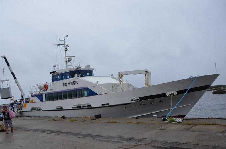 舳倉島探検 2015年2月1日更新お盆8月16日に子供たち2人と舳倉島(へぐらじま)へ行きましたのでご紹介します。舳倉島は能登半島先端、輪島からおよそ50km。周囲およそ5km。1時間もあれば歩いて一周できます。以前は無人島で、夏季のみ海女さんが移住しておりましたが、近年100名以上の定住者がいらっしゃるようです。漁業は主に海女さんによるアワビやサザエ海藻類採取。自然保護に重きを置き、観光地として売り出しておりませんので開発は最低限。お店無し。自販機無し。車無し。人々は漁港近くに住み、あとは自然ばかり。見どころは鳥達です。渡り鳥の格好の休息地であるため、全国から野鳥観察の人々が訪れます。確認されている野鳥は300種以上、ただ不思議なことに国内で年間を通じて見る鳥はほとんどいません。スズメはいません。カラスも一羽も見かけませんでした。島へ渡るには、1日一往復の定期船(ニューへぐら)に乗ります。片道1時間30分、午前9時輪島港出発→午前10時30分舳倉島着、午後3時舳倉島出発→午後4時30分輪島港着。往復運賃4520円。昔懐かしい電車の切符のようなものを購入し、乗船ごとに係員がポチンと切れ目を入れます。ただ、海が荒れている時には出港しませんので、お天気に注意する必要が有ります。朝7時までに決定されるとのこと。当日はやや雨風が強かったのでやきもきしました。[定期船ニューへぐら]旅客定員119名。座席と窓がある客室の下に座敷のような客室があります。下の客室では外は見えませんが、寝転ぶことができるようです。[客室入口]ここに自販機、トイレがあります。客室は禁煙ですが、中に喫煙室があります。ただし、そこでたばこを吸うと客室内へ匂いが漏れてくるので吸わないほうが無難です。[ニューへぐら客室]輪島港出発時のお客さんは定員半分くらいでしょうか。隣席の方にお聞きすると、ほとんどが島民とのこと。お盆のお墓参りの帰りなのでしょう。帰りは私達貸し切り、申し訳なくて小さくなっていました。[客室]当日は雨でしたので、外はあまり見えませんでした。残念。[午前10時30分舳倉島着]わびしい漁港という感じです。[早速あちこち歩きまわる息子の1人30歳] [漁港繁華街]昭和初期の田舎の面影ですね。お店は有りません。[漁港繁華街][舳倉島民宿つかさ]舳倉島の民宿は2軒、そのうちの一軒です。ベテランの海女さんが経営していらっしゃいます。もう一軒は「つき」。ご姉妹だそうです。予約はかなり前にしないとなかなか取れません。[島の道]繁華街の端っこ(漁港から数百メートルほど)から、このような舗装道が島を巡っています。一周しても1時間くらい。重い荷物もありましたが、釣り場探しを兼ねて歩いてみることにしました。[島の道]山は有りません。平地ばかり。なにしろ島の一番高いところでも標高12mほど。津波が来たらどうするのだろうと子供たちと話し合いました。灯台に逃げ込めば100人ほどは大丈夫かな。道の両側はご覧のとおり草地です。道が草で覆われないように島の方が頑張っていらっしゃるのでしょうね。[左巻きのかたつむり]日本のかたつむりは右巻きがほとんど。舳倉島では左巻きです。[ケルン]島のあちこちにこのような石を積んだものがあります。これは、海女さんが潜る場所の目印にしたものだそうで「ケルン」と呼ばれています。[恵比須神社]恵比須様は七福神のひとり。漁業繁栄の神様です。[無他神社 観音堂]藩政末期のこと。一旭上人(いっきしょうにん)という僧が島にきて、毎晩観音堂に島民を集めて説教をしていました。いつも若い女が訪れ、末座で熱心に聞き入っているので、一旭上人がたずねると、女は「私はこの池に棲む竜なのです。難破船の錨の毒にあたって死んだのですが、未だに成仏できずにいます。どうか助けて下さい。」と涙を流して頼むのでした。そこで翌朝、島民が池の水をくみ上げてみたら、池の底から大小二体の骨が見つかりました。骨は樽四杯分にもなったそうです。人々は父親の竜が現在も近くの海に生息していると考え、神として祭って無他神社としました。(輪島市観光情報より)[竜神池]龍神の骨が見つかった池です。観音堂のそばに有ります。 [竜神池礼拝所][海岸]島の周りは溶岩のような岩場がほとんど。砂浜は有りません。水がとてもきれいです。[灯台]以前は海上保安庁の職員が常駐していたそうですが、今は無人。上まで上がれば島全体が見渡せます。[七つ島]帰りの定期船から写した七つ島です。写真では見えませんが、海岸に鳥達が群れていました。☆輪島市の旅館、ホテルご紹介⇒[輪島市 (1)] [輪島市(2)]☆ホームでは、石川県全域のお宿をご紹介しています。どうぞきまっし石川→ホームへ戻る