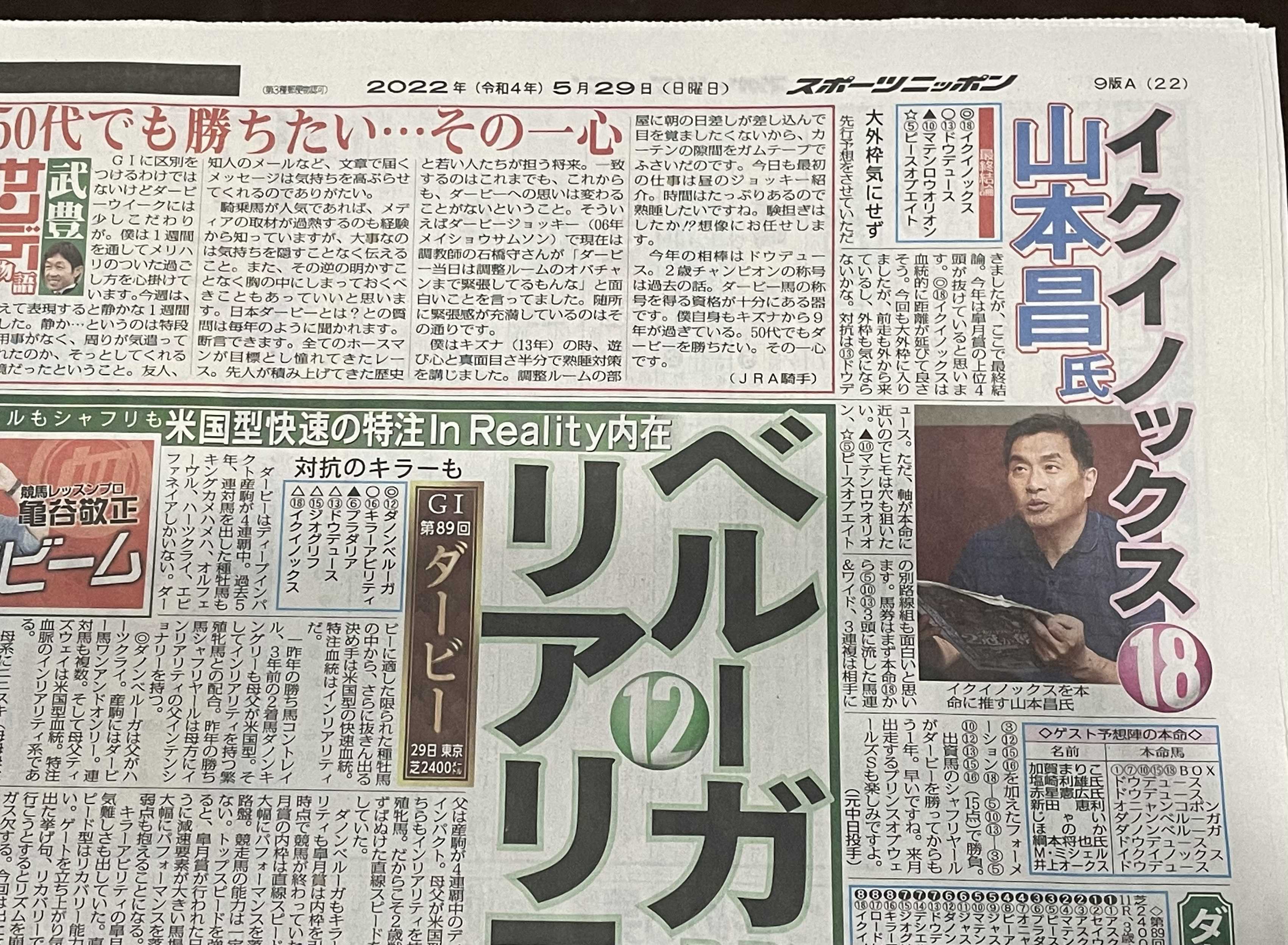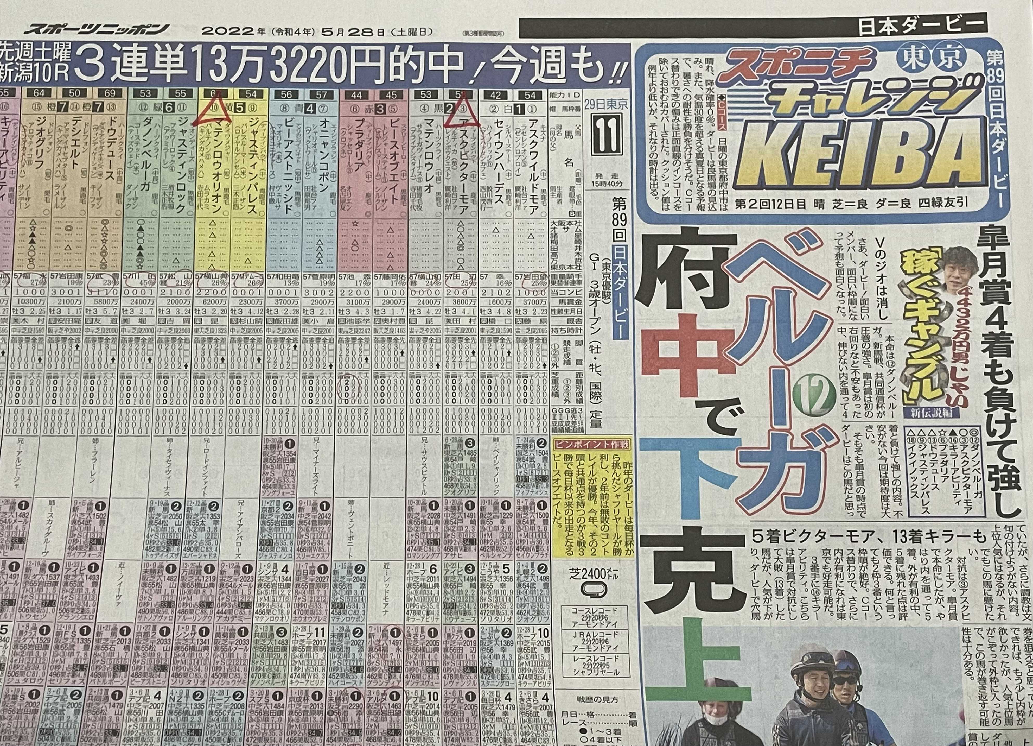 今日のダービー、新聞やネットで情報を集めている人も多いだろう。だけど、記者や評論家だけでなく芸能人などの予想を見ると千差万別。まともに読んでいたらどの馬も入りそうで馬券が決まらない。時分はいつもの通り1、2番人気+伏兵の三連複でいく。△は皐月賞以外の③⑤⑥⑩への4点。