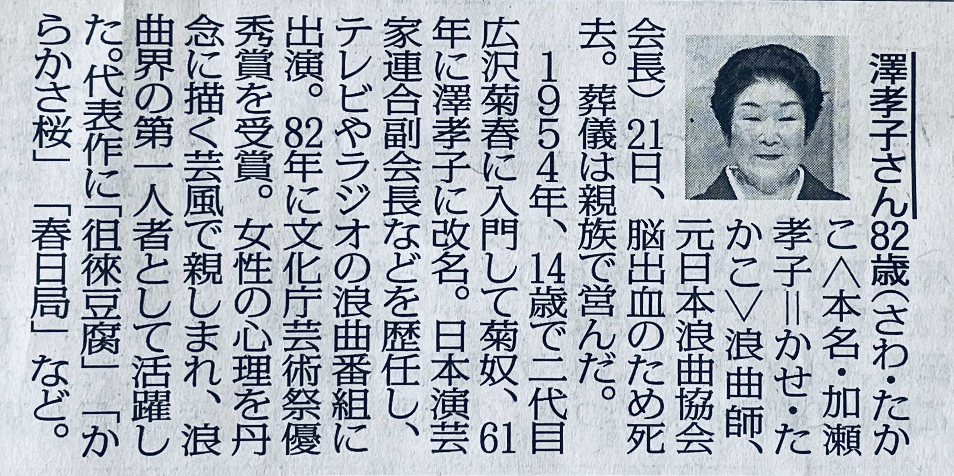 初めて浅草の木馬亭で浪曲を見た日、最後に登場したのが澤孝子師であった。他の演目と同様、何気に見ていたところ、節に入るやすぐさまその口から語られる物語に没入した。登場人物の情感がそのまま自分の脳に伝わるような語り口。僕は魅了された。その時の曲師は佐藤貴美江さんで、その三味線にも心を奪われた。通常三味線の前にはは衝立が置かれ、客席からは曲師の姿は見えないのだけど、澤師のときだけは「出弾き」といって衝立なく客席からも見られるようになっていた。それは僕が浪曲三味線教室に通うきっかけとなった舞台でもある。澤孝子師の舞台がもう木馬亭で見られないというのは本当に残念。合掌。