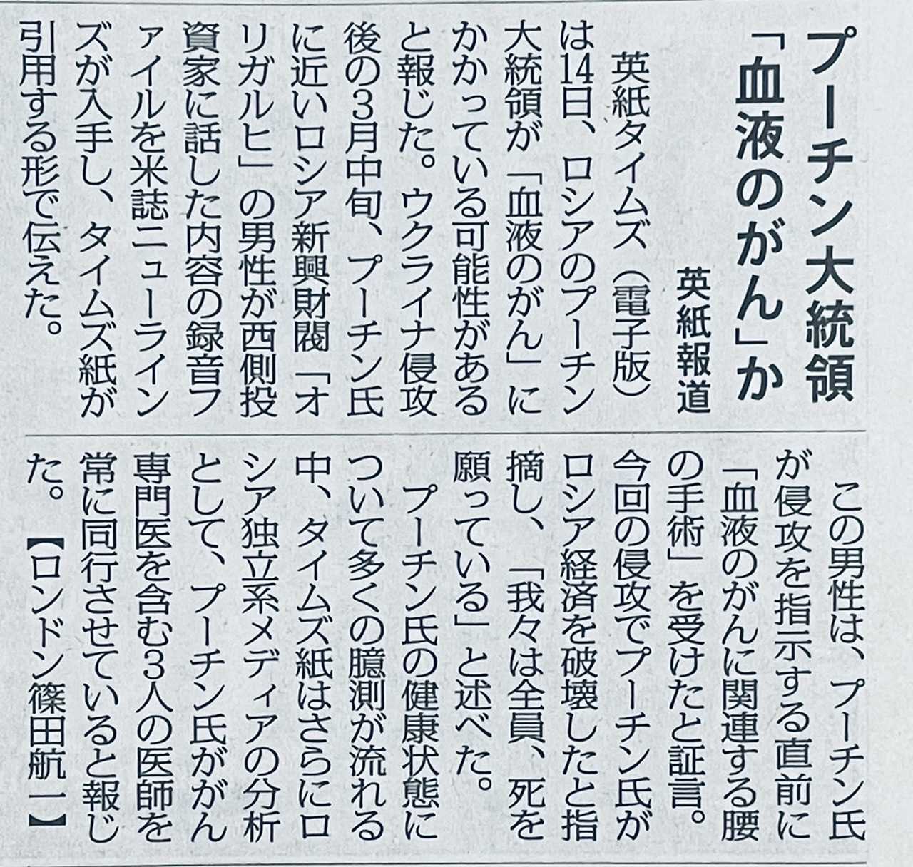 今朝の毎日新聞より。プーチンの体調不安についてはいろいろな話が出ているけど、信頼できるのかはこの記事も含めて冷静に見ないとね。