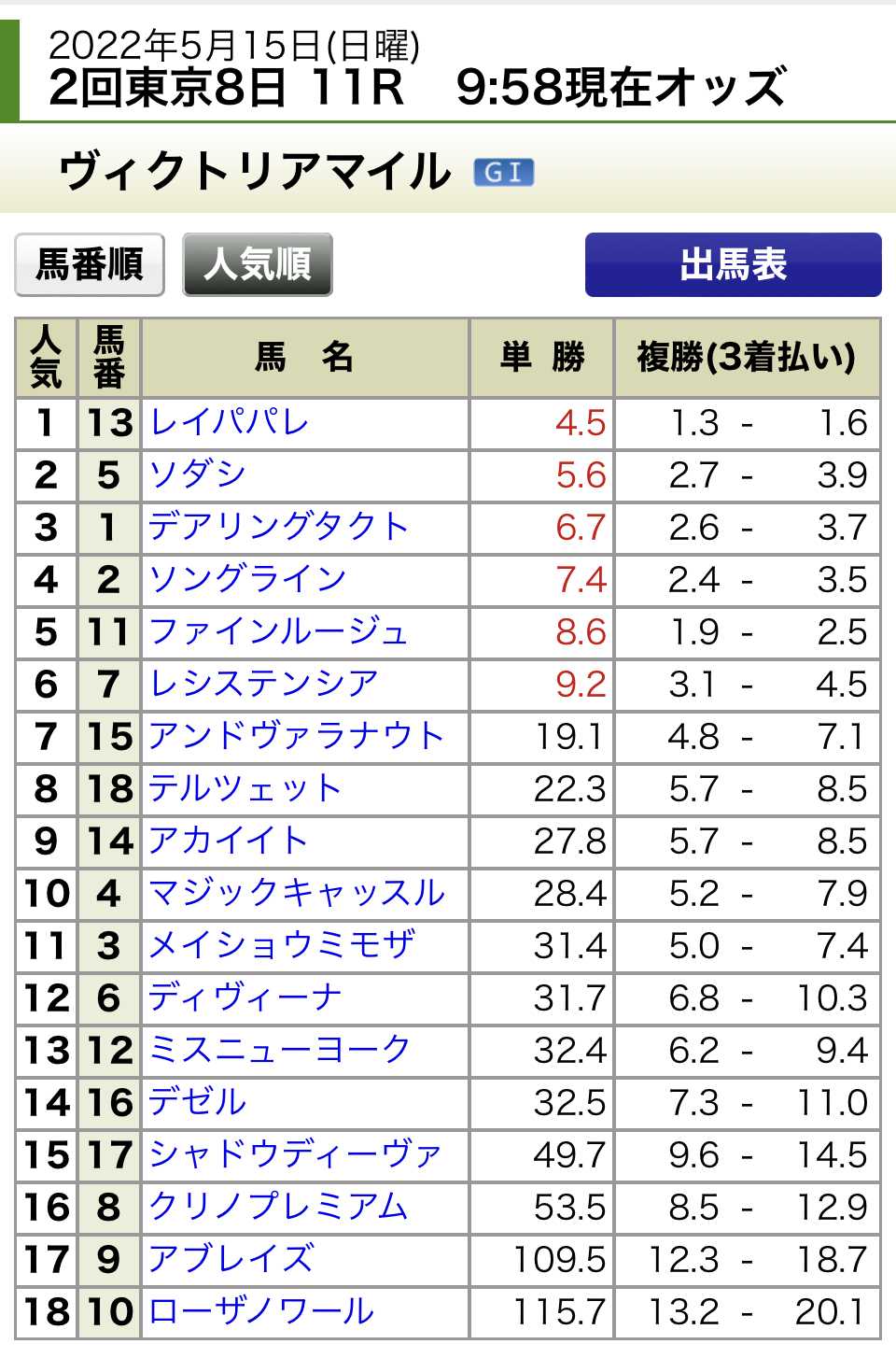 今日のヴィクトリアマイル、レイパパレの1番人気は変わらないが、2番人気にソングライン、ソダシ、ファインルージュの3頭が6倍前後でほぼ並んでいる。馬券が絞れない人が多いだろうね。可能性を考えればキリがないのでレイパパレを中心に相手を4頭に絞った。馬券は3連複フォーメーションで⑬→②⑤⑪⑮の計6点。
