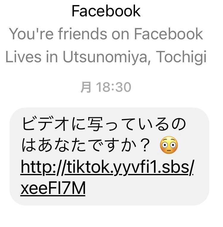 「ビデオに写っているのはあなたですか?」先日、見知らぬ人物からメッセンジャーにこんなメッセージが届いた。不審に思い、放置していたところ、また別の人物から同じメッセージが来た。これは怪しい。こんなときは検索するに限る。同じメッセージは多くの人に届いているらしく、結果は乗っ取り誘導であった。この「tiktok」のURLを通じてFBのIDやらを入力させ思うがままにするのが目的らしい。ご注意を。