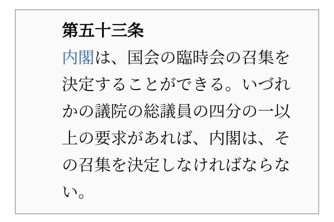 要求があったのだから、内閣は召集を決定しなければ憲法違反になる。「応じない」ということはそもそもできない。また召集するのは内閣で国会ではないから「国会のことは国会がお決めになること」という屁理屈も通用しない。岸田ははやく臨時国会の召集を決定しなければならない。