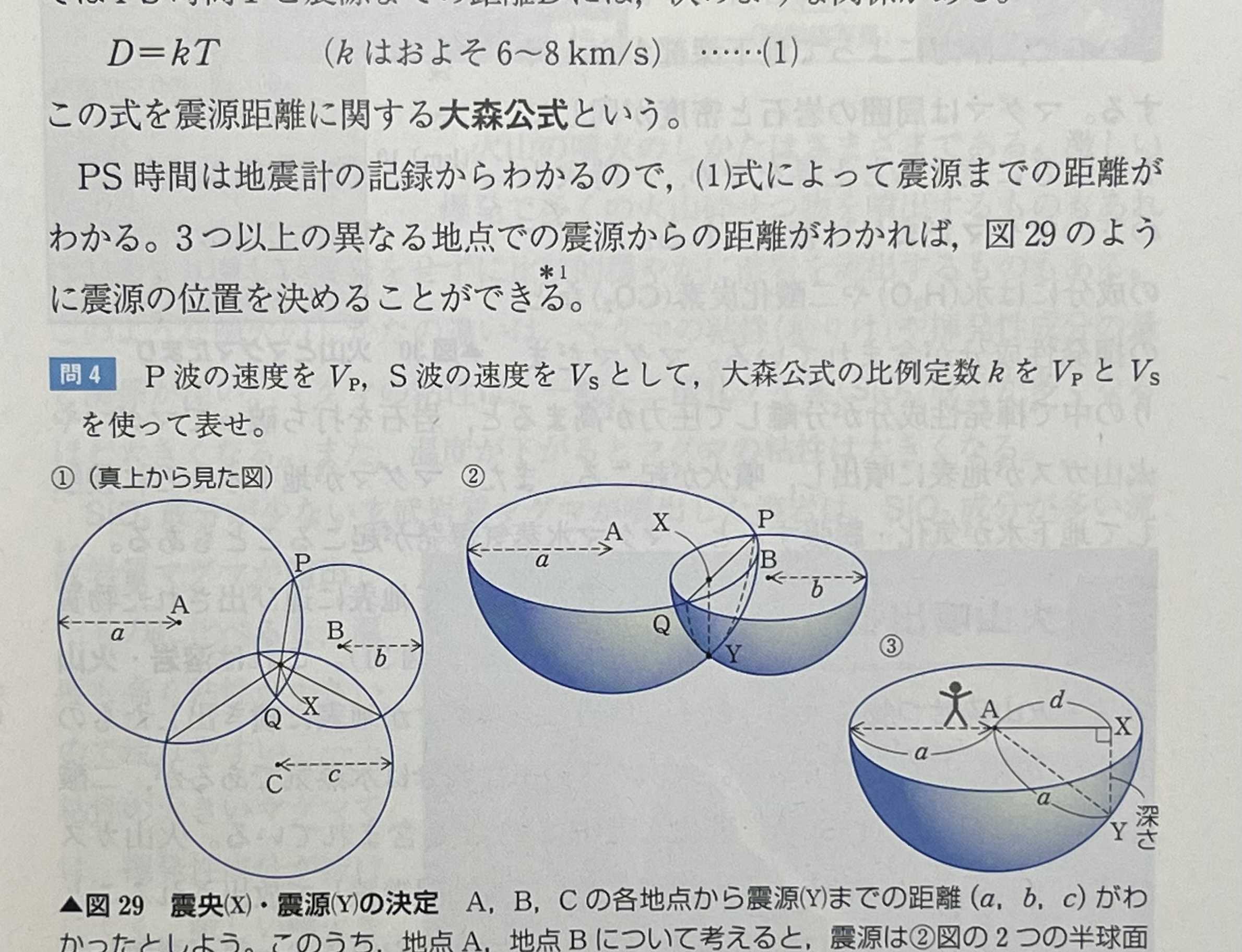 地学は大森公式。震央、震源の特定は図を見ると複雑そうだけど、よく見ればシンプル。
