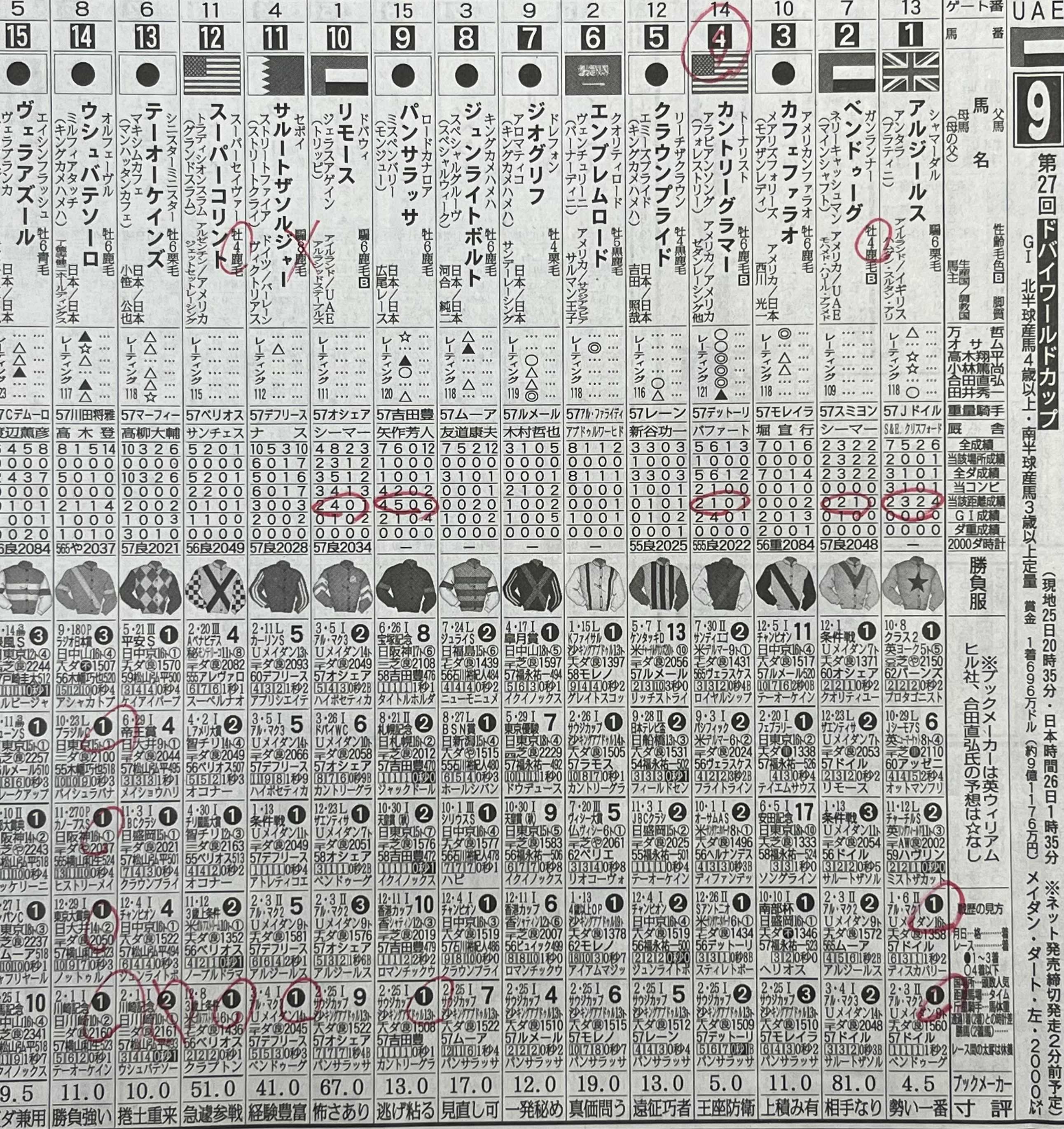 ドバイの国際レース。6~9レースまでの出馬表を見ると、合計で19頭もの日本馬が出走している。いくら賞金がいいといっても、これは出過ぎなんじゃないかな。馬券もJRAで独自に発売していて過去何度か買ったことがある。オッズを見ると、ブックメーカーのそれと比較するとやはり日本馬びいき。ということで天邪鬼の吾輩は4つのレース、日本馬をすべて外して外国馬の単勝を買うことにした。9レースは④カントリーグラマーが勝ちそうだな。