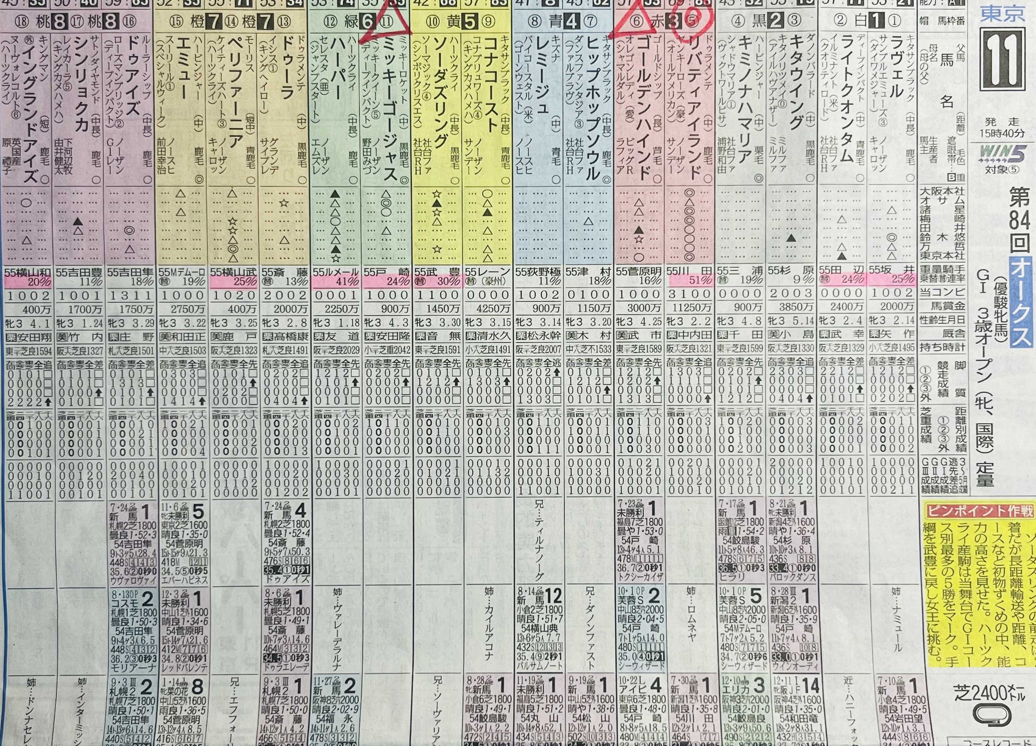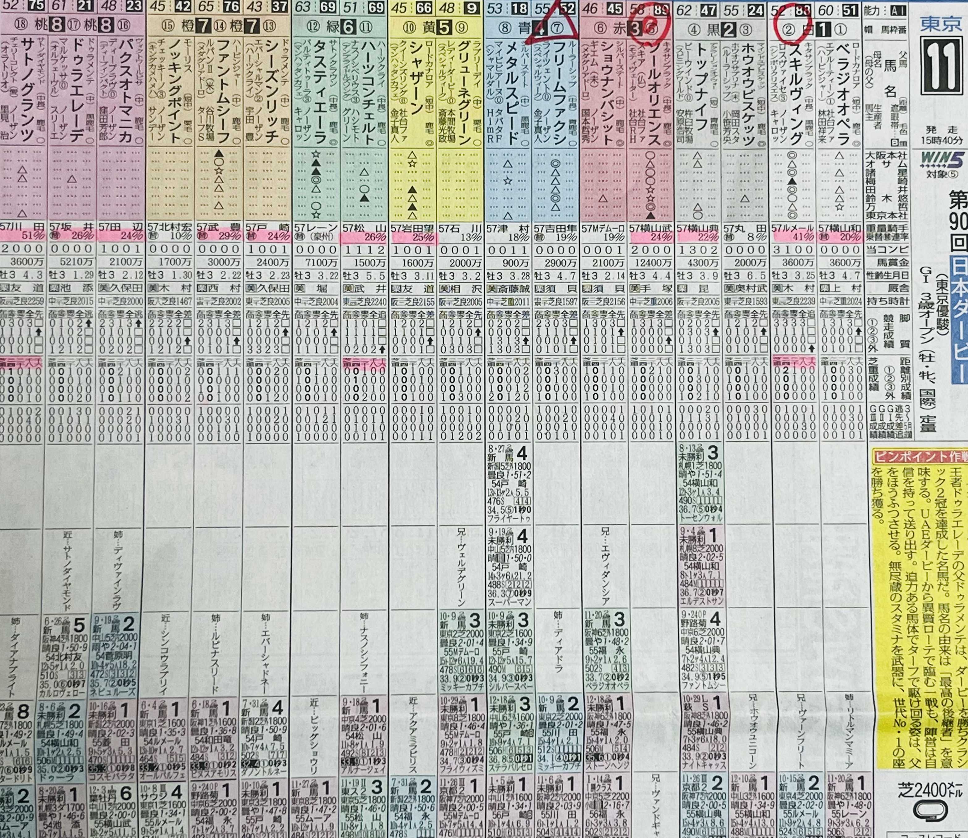 いろんな人の話を聞いていると、どの馬も買いたくなるけど、やはり人気は無視できず、1・2番人気の皐月賞1着の⑤と2400の実績がある②の2頭は3着までには入ると予想。△は⑦のフリームファクシ。馬券は3連複2=5=7と2・5・7のボックス馬連の計4点。