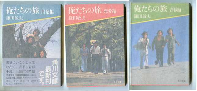 「俺たちの旅 全3巻揃い 青春編/恋愛編/出発編」鎌田敏夫/著中村雅俊・秋野太作・田中健/カバー写真角川書店・角川文庫昭和60年発行の初版・「出発編」帯付並;紙カバーのため角・フチ部極少すれ・若干スレ有、背上極少しわ、小口下角部l極少汚れ、「青春編」表紙上部極少しわ、帯極少すれ *昭50に放映された同名TVドラマをメイン脚本家だった鎌田敏夫が書き下ろしにてノベライズ*放映10年後のTVスペシャルドラマ放映前にタイアップとして刊行 *表紙はカースケ(中村雅俊)・グズ六(秋野太作)・オメダ(田中健)の3人の写真を起用(3冊とも写真は異なります 販売価格=2,900円(2022/01/19現在の在庫・価格です)===========================<お問合せ先>絶版漫画バナナクレープ〒542-0066 大阪市中央区瓦屋町2-10-14 第三天偉ビル4階TEL 06-6765-7144HPアドレス http://www.bananacrepe.net/e-mail bananacrepe@mbk.nifty.com営業日・時間=平日 14:00~20:00/日・祝日 12:00~20:00/水曜定休