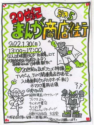 20世紀のまんが・アニメ・特撮・TVゲーム・ラノベ関連商品の即売会2022年1月30日(日曜)13:00~17:00なんば味園ビル2階「紅鶴」にて(大阪市中央区千日前2-3-9)各線なんば・日本橋駅すぐ入場無料(ワンドリンクオーダー制)【参加店】(敬称略)絶版漫画バナナクレープブックスよんちくわや書店ちくわ堂ブリティッシュバタードッグ怪獣大百仮店DIGGIN'大吉堂*マスク着用必須*感染症対策に留意して開催いたします。ご協力お願い致しますなんば・味園ビル外観アクセスは2ヶ所から。南側からスロープで直接2階へ東側からは階段で。2階にあがって右へ折れて突き当たりを左へどっさり詰んでお待ちしております(前回の当店「絶版漫画バナナクレープ」のブース)=============絶版漫画バナナクレープ〒542-0066 大阪市中央区瓦屋町2-10-14 第三天偉ビル4階TEL 06-6765-7144HPアドレス http://www.bananacrepe.net/e-mail bananacrepe@mbk.nifty.com営業日・時間=平日14:00~20:00/日・祝日12:00~20:00/水曜定休
