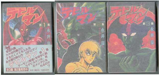 「デビルマン 全3巻揃い」永井豪講談社・KCスペシャルKCSP(B6判厚冊)1983年発行初版・(1)帯付並:(1)背上角部極々少シワ、(2)(3)背下角部極少シワ、帯=背上部若干シワ・背下角部極少イタミ *元々帯が付いているのは第1回配本の1巻目のみ *初版の揃いは滅多に出ません *漫画史上最高傑作販売価格=8,700円(2022/05/12現在の在庫・価格です)現在「東映アニメーションミュージアムチャンネル」で期間限定放映中!https://www.youtube.com/channel/UCUUekIrulAiJnUOawqBRwZQオトナになってアニメを見返したら、「人間守ってない、ミキちゃん「だけ」守ってる」のがよおおおくわかりました あと田中亮一さん(不動明)の声が(ちっちゃいころも思ったけど)やっぱりステキだー!===========================<お問合せ先>絶版漫画バナナクレープ〒542-0066 大阪市中央区瓦屋町2-10-14 第三天偉ビル4階TEL 06-6765-7144HPアドレス http://www.bananacrepe.net/twitter https://twitter.com/bananacrepeZe-mail bananacrepe@mbk.nifty.com営業日・時間=平日 14:00~20:00/日・祝日 12:00~20:00/水曜定休