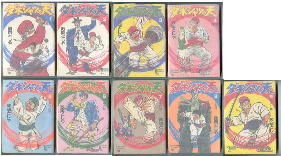 「ダボシャツの天 全9巻揃い *全編収録」政岡としや徳間書店・トクマコミックスTC(B6判)昭和59年発行の初版並;小口ヤケ少汚れ、背上しわ、(1)背下少しわ・角部極少しわ・カバー上フチ部少しわ、(2)極少背ヤケ・背下少しわ・角部極少しわ・カバー上フチ部少しわ、(3)少背ヤケ・背下極少しわ少すれ・表紙右フチ部と裏表紙左フチ部ヤケ・裏表紙右下部極少折れ、(4)少背ヤケ・背下しわ・カバー上フチ部少しわ・表紙左下角部曲粗油折れ・裏表紙右上角部極少イタミ・本文前半下角部ぬれ・本文上角部しっけ、(5)背下角部少しわ・表紙上フチ部極少しわ・表紙右上部極少欠・前余白頁フチ部折れ、(6)背下しわ・カバー上フチ部極少しわ・裏表紙右上角部から本文数枚上角部若干折れ、(7)背上角部極少イタミ・背下しわ・角部極少しわ・奥付頁上角部しみ・カバーの表紙側下角部にしみ、(8)背ヤケ・角部少しわ・表紙右フチ部と裏表紙左フチ部ヤケ、(9)少背ヤケ・背下角部しわとイタミ、前余白頁少汚れ*大阪を舞台にしたヤクザマンガです *「週刊漫画TIMES」昭48連載 *川谷拓三主演で昭52に映画化 *過去の単行本(少年画報社版、ペリカンブックス版、コミック1000版)は不完全で、当書で初めて全編単行本収録されました *全巻各240ページ販売価格=4,700円(2022/09/19現在の在庫・価格です)===========================<お問合せ先>絶版漫画バナナクレープ〒542-0066 大阪市中央区瓦屋町2-10-14 第三天偉ビル4階TEL 06-6765-7144HPアドレス http://www.bananacrepe.net/twitter https://twitter.com/bananacrepeZe-mail bananacrepe@mbk.nifty.com営業日・時間=平日 14:00~20:00/日・祝日 12:00~20:00/水曜定休