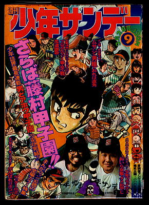 「週刊少年サンデー」昭和50年3月2日号(9号) 表紙・背表紙画「男どアホウ甲子園」(佐々木守&水島新司の写真も有) 「男どアホウ甲子園」水島新司・最終回/「牙戦」あだち充・滝沢解(単行本未収録)/「おいら女蛮」永井豪/「ゲッターロボ」石川賢 水島新司、あだち充・滝沢解、永井豪、石川賢 ほか小学館アンケートハガキ付、並上;背上少痛 背表紙に製本による縦じわ有 背表紙フチ部少スレ*4色カラー画報:皇帝ベッケンバウアーの華麗なプレー!(サッカー)*「男どアホウ甲子園」佐々木守/水島新司(4色2色オールカラー 最終回 長嶋茂雄も登場。 24ページ) 「ムサシ」川崎のぼる/小池一雄(小池一夫 2色カラー 21ページ) 「男組」雁屋哲/池上遼一(20ページ) 「プロゴルファー猿」藤子不二雄(竜も登場。 20ページ) 「牙戦」滝沢解/あだち充(単行本未収録 20ページ) 「おいら女蛮」永井豪(ふじむら幼稚園&レンタン登場。 18ページ) 「柔道讃歌」梶原一騎/貝塚ひろし(vsアブドーラ・ハッサン 20ページ) 「バハハ大放送」山口琢也/おだ辰夫(お色気シーン有。 武居大貴社も登場。 4ページ) 「ダメおやじ」古谷三敏(13ページ) 「少年フライデー」赤塚不二夫(13ページ) 「おれは直角」小山ゆう(19ページ) 「がんばれ!ロボコン」石森章太郎(11ページ) 「サンデーテレパックコーナー」ウルトラマンレオ(vsブラックガロン 写真とイラストで構成。 カット画:池尻克美 2ページ) 「ゲッターロボ」永井豪/石川賢(13ページ)販売価格=6,000円(2025/4/10 現在の価格です)==================<ご注文&お問合せ先>絶版漫画バナナクレープ〒542-0066 大阪市中央区瓦屋町2-10-14 第三天偉ビル4階TEL 06-6765-7144HPアドレス http://www.bananacrepe.net/twitter https://twitter.com/bananacrepeZe-mail bananacrepe@mbk.nifty.com営業日・時間=平日 14:00~20:00/日・祝日 12:00~20:00/水曜定休
