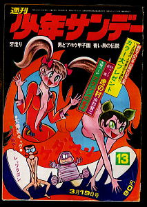 「週刊少年サンデー」昭和47年3月19日号(13号) 表紙画=永井豪(「ケダマン」掲載)/「アラジンの息子」園田光義(単行本未収録)/「虎の村」由紀賢二(単行本未収録)/「日吉の城」貝塚ひろし(単行本未収録) 永井豪、ジョージ秋山、北野英明、水島新司、手塚治虫、園田光義、由紀賢二、貝塚ひろし ほか小学館(B5判平綴じ雑誌)並上;背表紙に製本による縦じわ有、角・端部少スレ・少しわ、裏表紙左端部折れ、裏表紙右下部少痛、少折れ、貝塚と大倉のページの下角部少折れ *表紙画「ケダマン」永井豪、背表紙画「ダメおやじ」古谷三敏 *「男どアホウ甲子園」佐々木守/水島新司(扉4色カラー 24ページ 1ページ上端部少切れ) 「青い鳥の伝説」石井いさみ(21ページ) 「木枯し紋次郎じゃなかったレッツラゴン」笹沢左保じゃなかった赤塚不二夫(へんな子ちゃん的な女の子がメインで登場。 15ページ) 「ベラマッチャ動物学」山口琢也/松下ちよし/おだ辰夫/ばらさかき(4ページ) 「牙走り」ながやす巧/小池一雄(=小池一夫 時代劇 22ページ) 「ダメおやじ」古谷三敏(10ページ) 「ケダマン」永井豪(多蘭ちら登場。 16ページ) 「ダスト18」手塚治虫(後に「ダスト8」として大幅改稿された作品で、当話は第4話ですが「ダスト8」ではラストエピソードにされました。 20ページ) 「アラジンの息子」飛鳥日見子/園田光慶(単行本未収録 25ページ) 「虎の村」由起賢二(=フジオプロ 前編 単行本未収録 30ページ) 「プロ野球に危険信号!!」(カット画:水島新司 5ページ) 「ザ・ムーン」ジョージ秋山(新連載予告 トータルで7ページ) 「日吉の城」貝塚ひろし(単行本未収録 時代劇 20ページ) 「チャレンジD」石堂淑朗/大倉元則(単行本未収録 ミュンヘンオリンピックを目指す体操マンガです。 20ページ) 「サイボーグエース」ジャック=ラカン/北野英明(最終回 20ページ)*裏表紙の裏は田宮模型の広告です販売価格=3,600円(2025/3/17 現在の価格です)===========================<ご注文&お問合せ先>絶版漫画バナナクレープ〒542-0066 大阪市中央区瓦屋町2-10-14 第三天偉ビル4階TEL 06-6765-7144HPアドレス http://www.bananacrepe.net/twitter https://twitter.com/bananacrepeZe-mail bananacrepe@mbk.nifty.com営業日・時間=平日 14:00~20:00/日・祝日 12:00~20:00/水曜定休