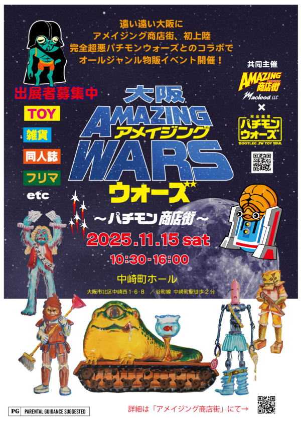 「大阪アメイジングウォーズ」とき:2025年11月15日(土曜) 10:30~16:00ところ:中崎町ホール (大阪市北区中崎町1-6-8)*TOY・雑貨・同人誌・フリマ等即売会*当店「絶版漫画バナナクレープ」は、絶版・プレミアまんがのほか、アニメ・特撮関連本、絶版キット・プラモデル等々を出品予定です!!詳細は「アメイジング商店街」にて https://macleod.jp/amazing/===============<お問合せ先>絶版漫画バナナクレープ〒542-0066 大阪市中央区瓦屋町2-10-14第三天偉ビル4階TEL 06-6765-7144HPアドレス http://www.bananacrepe.net/X(twitter) https://twitter.com/bananacrepeZe-mail bananacrepe@mbk.nifty.com営業日・時間=平日 14:00~20:00/日・祝日 12:00~20:00/水曜定休