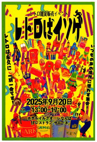 <レトロ雑貨即売イベント 【レトロはイソゲ】>2025年9月20日(土曜)←13:00~17:00ホテルイルクォーレなんば1F レストラン「サローネ」(〒556-0011 大阪市浪速区難波中1丁目15-15)大阪メトロ御堂筋線「なんば駅」から徒歩約2分南海本線「なんば駅」から西へ徒歩約2分近鉄本線「大阪なんば駅」から南へ徒歩約5分当店「絶版漫画バナナクレープ」は、#絶版プラモ #旧キット #アニメ&特撮の本 や #絶版漫画 などを販売しま~す!!!▼前回の様子