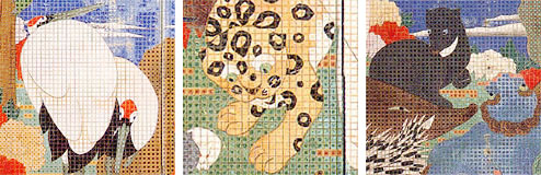昨日はめまぐるしい長い一日。大好きな京都で、真夜中ドラッグクィーンの集うイベントで楽しみ、トラブルゥに落ち込み、美学の恩師との再会に喜び、アップダウンの激しい頭の中がハレルヤ状態!の中、伊藤若冲展を観に行きました。かなりの盛況ぶり、日本画にさほど触手が伸びなかった自分を恥じました。若仲の絵、かっこいいし、おもしろいし、かわいいんです。写真は館内の隠し撮りではありません、小さな屏風型のスーベニール。伊藤若冲筆 鳥獣花木図屏風(ちょうじゅうかぼくずびょうぶ)約86,000個の升目を描き、モザイクのようにみえます。この根気と技術だけでも目眩がするのに、絵の内容が忘れかけている純真な心の襞をくすぐるのです!確かな画力とデフォルメの遊び心。突出した二つを持っている比類ない日本画をみることが出来ました。