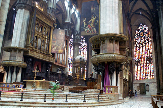 ミラノのドュオーモ(大聖堂)は、ミラノ公国の領主であったジャン・ガレアッツォ・ヴィスコンティ(ルキノ・ヴィスコンティのご先祖)により1388年より500年の歳月をかけて建てられました。ここに来るのは2度目ですが、イタリアを旅した中で私は、この建物が一番霊的エネルギーを感じます。思わず後ろへ倒れるほど、天井を仰いでしまう!鮮やかな光の絵本であるステンドグラスが、文盲の多かったかつての人々の為に優しく教えを説いています。なるほど、この圧倒的な空間の中では、誰しもひざまずき信心深くならざるを得ない。もちろん入場する人の服装制限もあります。(スカートはダメ)最も高い尖塔は109m、その先端には聖母像が金色に輝いています。第二次世界大戦では、ミラノは連日の空襲により焼け野原になってしまったそうですが、この「像」は、夜でも上空から見ることができたため被害を免れたといわれています。各地の偉大な美の遺産を、戦争なる愚行で奪われない世に早くなって欲しいと改めて願うのでありました。[美・變・探・索]12/11更新!
