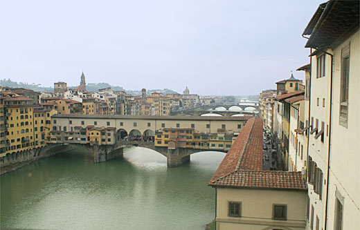 私がイタリアで一番好きな街、フィレンツェ。フィリッポリッピ・フラアンジェリコ・ボッティチェリ・ダヴィンチ・ミケランジェロ・ダンテ・・・数々の才能が花開いた、メディチの牙城です。どこをどういう風に書けばいいのか迷うほど魅力に満ちています。写真の屋根付き通路は、メディチ家がウフィツィ(行政諸官庁)から、アルノ川の対岸のピッティ宮殿まで通した約1kmのヴァザーリの回廊。ポンテヴェッキオ橋の2階に繋がっています。サンタ・マリア・デル・フィオーレ大聖堂のクーポラ、サン・ジョバンニ洗礼堂の門、ジョッドの鐘楼そしてウフィツィ美術館は、花の都の絢爛たる文化の象徴なのです。今でも治安はよく、人々は親切。この美しい光と風に包まれて、富裕な精神が育まれるのでしょう!