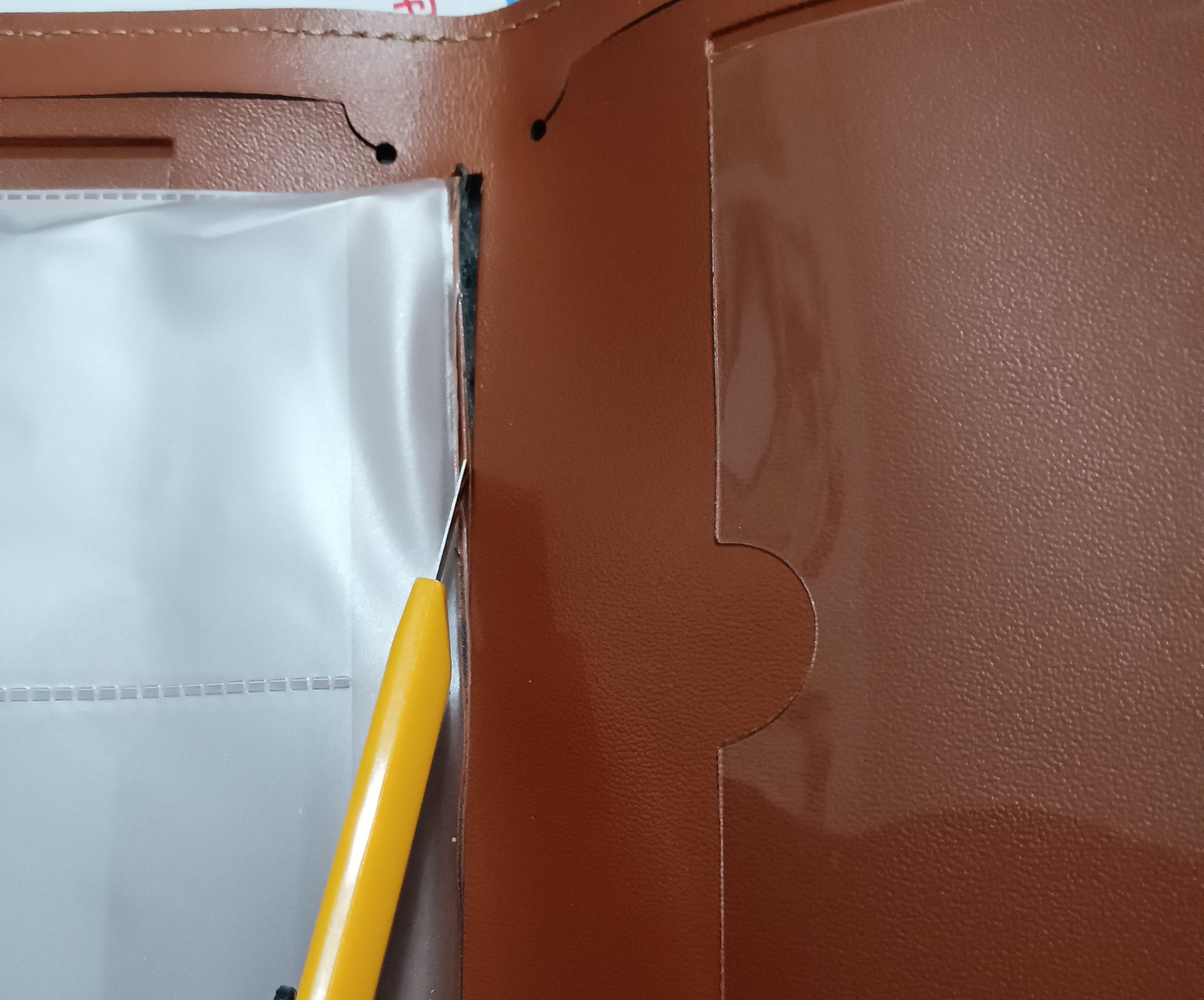 小さいサイズのものと違って、カードポケットがスリット式ではなく接着されている…。