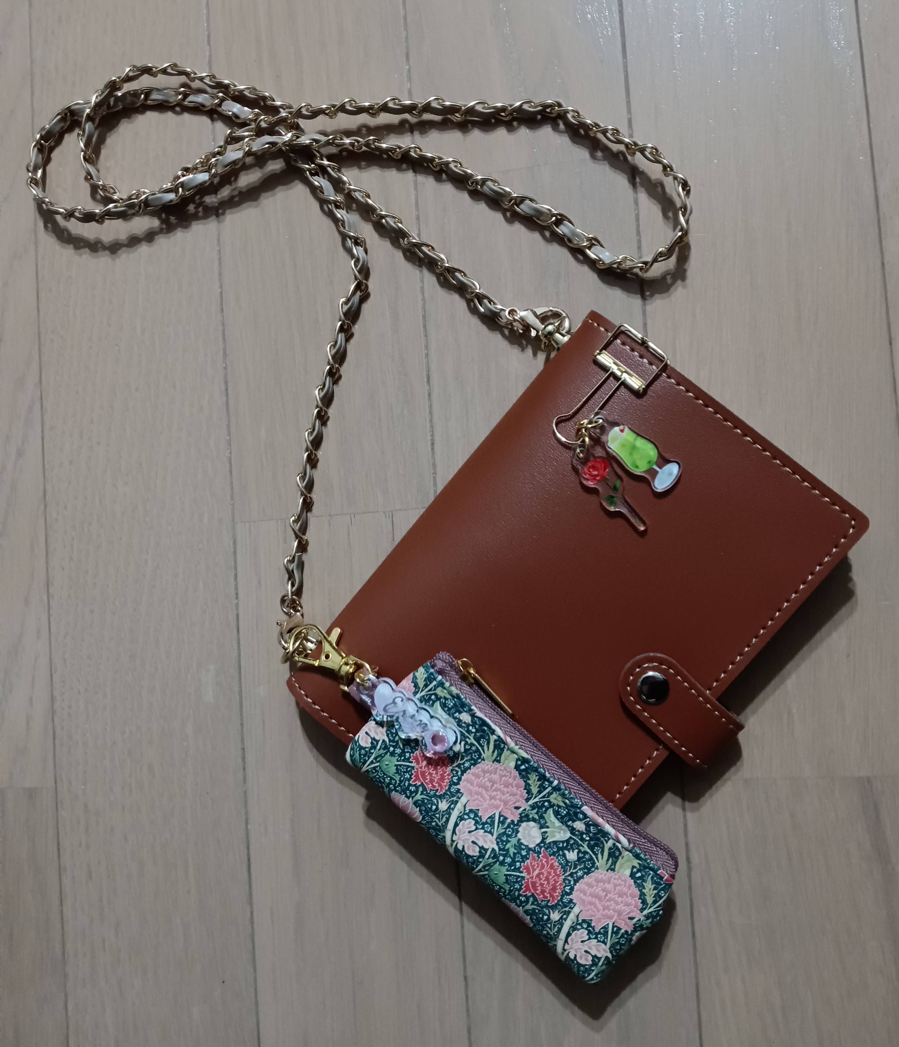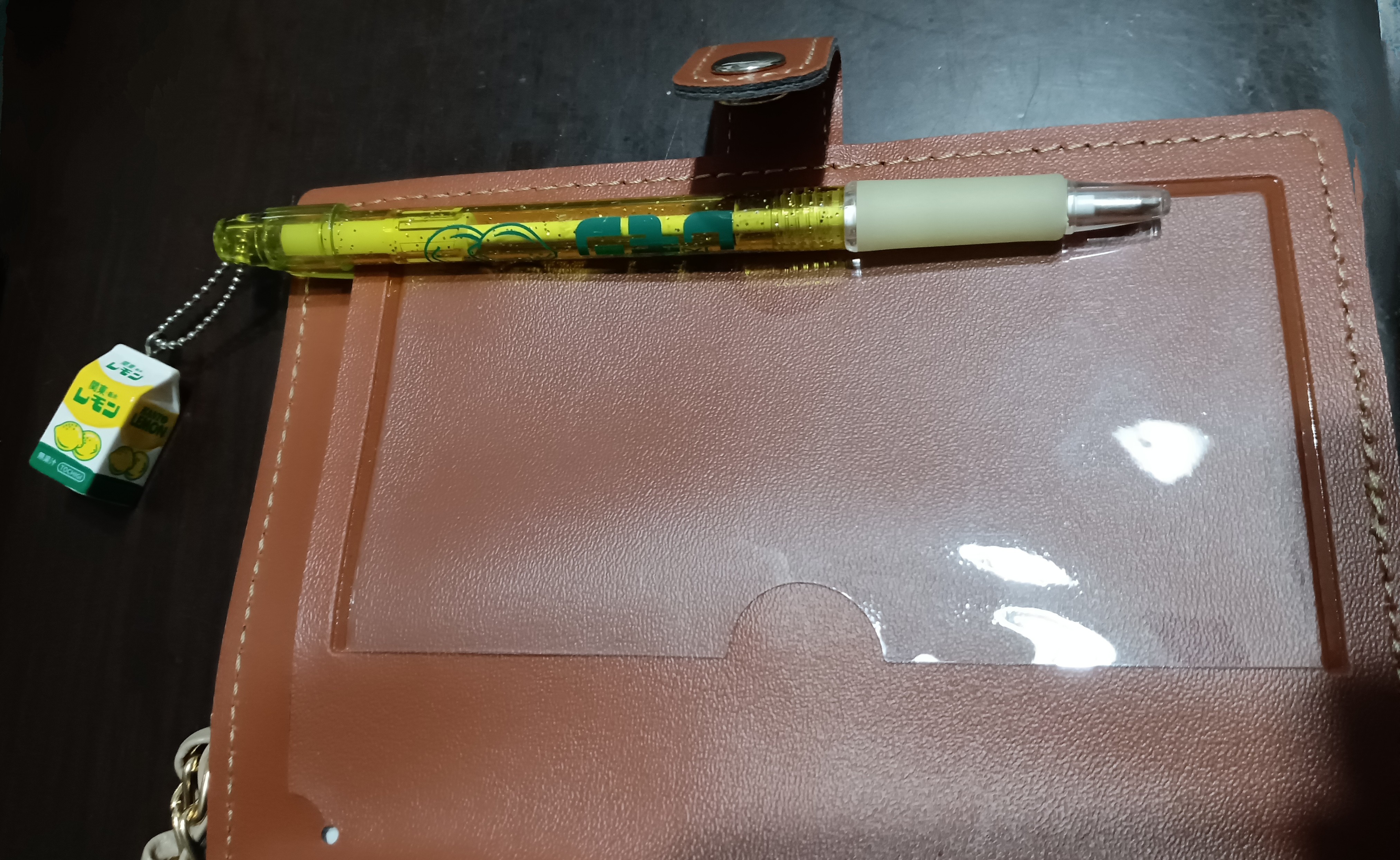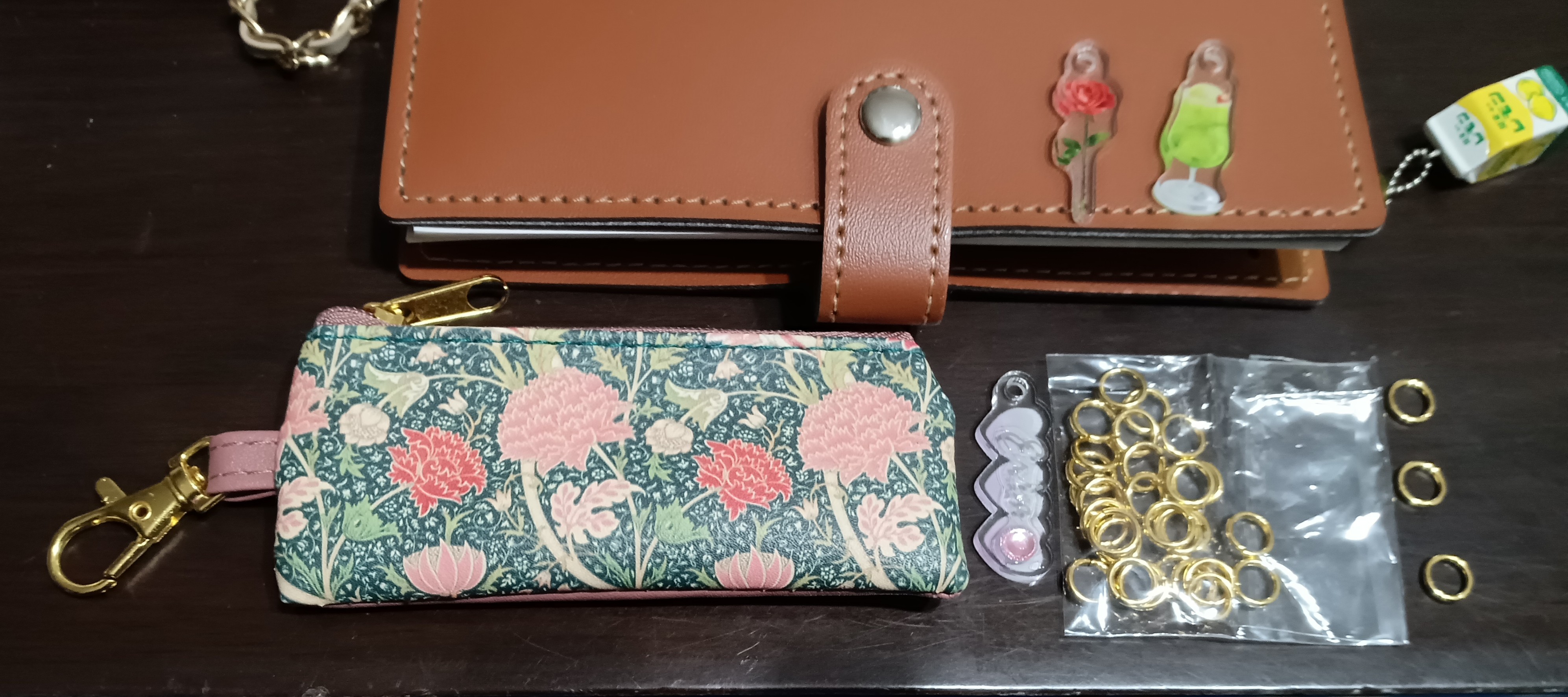 今までの手帳活動でお馴染みの、ダイソーのリーンクリップを手帳の表紙に挟んで、推し活で余ったアクリルチャーム(セリア)を、ダイソーの丸カンで付けました。スムーズに飲み物買えるようにコインケース(セリア)も付けちゃおう。