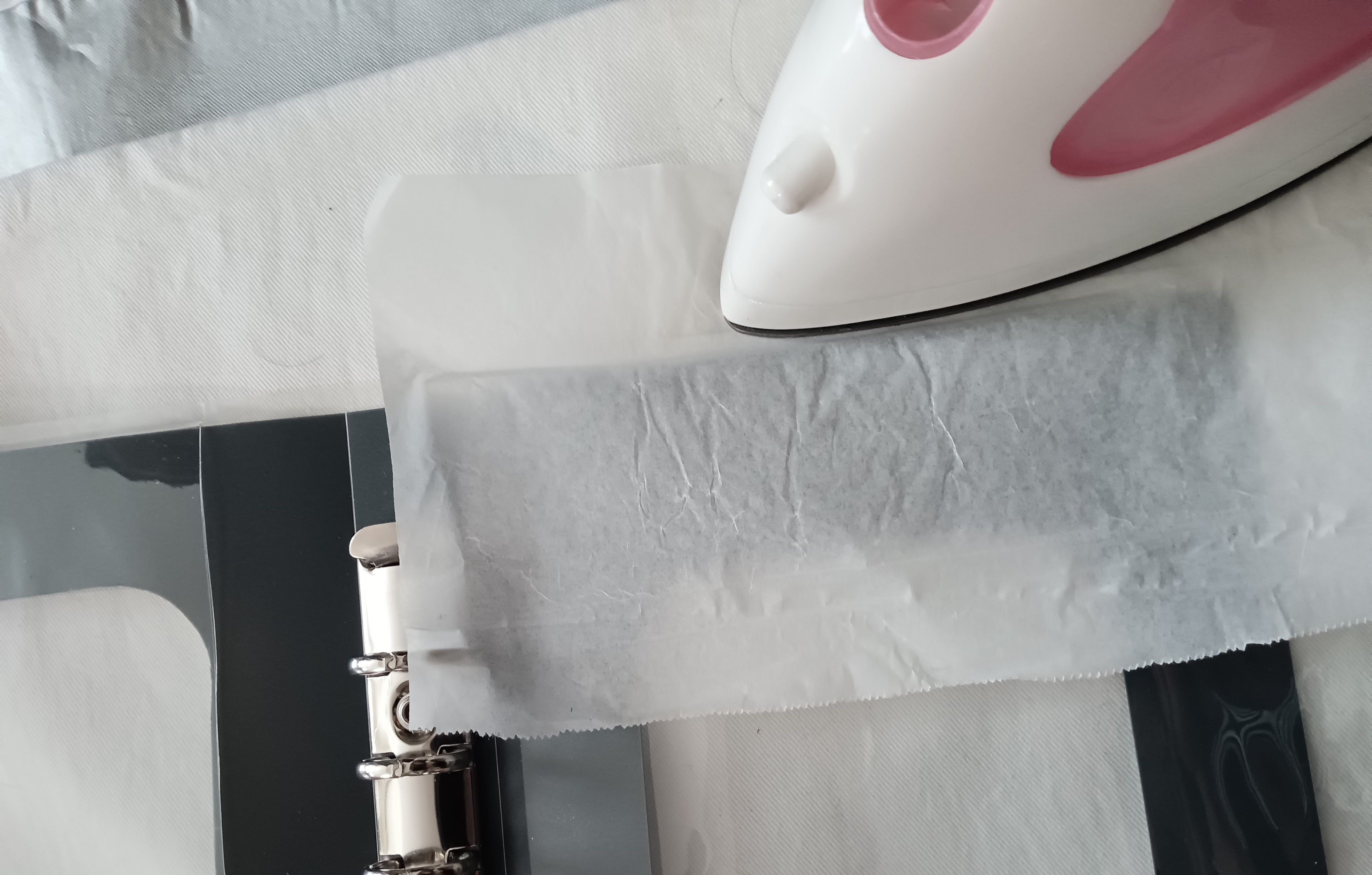 上部にオーブンシートを当ててアイロンの熱でくっつけたあと、最終カットして端を整える。