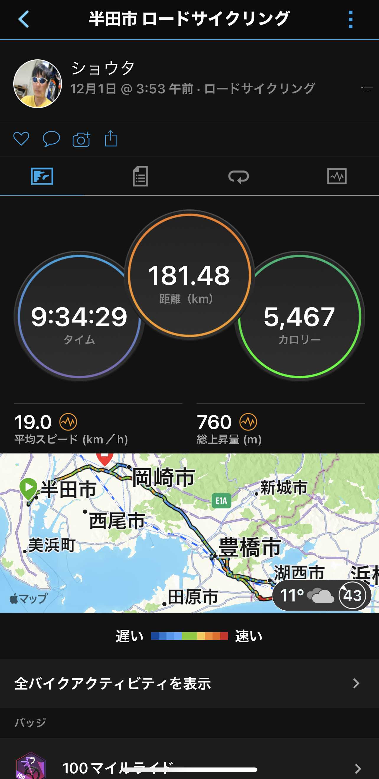 行きは102キロだったが平坦コース終始激追い風だったのでイメージですがほぼ漕がなくても着いた感じ^ ^