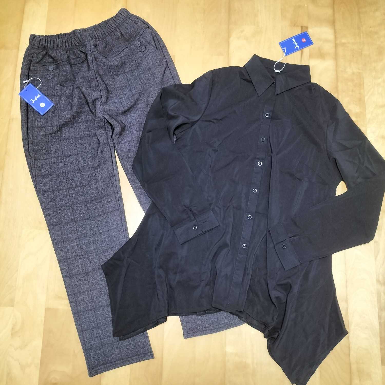 とろみ素材の変形シャツと、裏起毛のチェックパンツ。