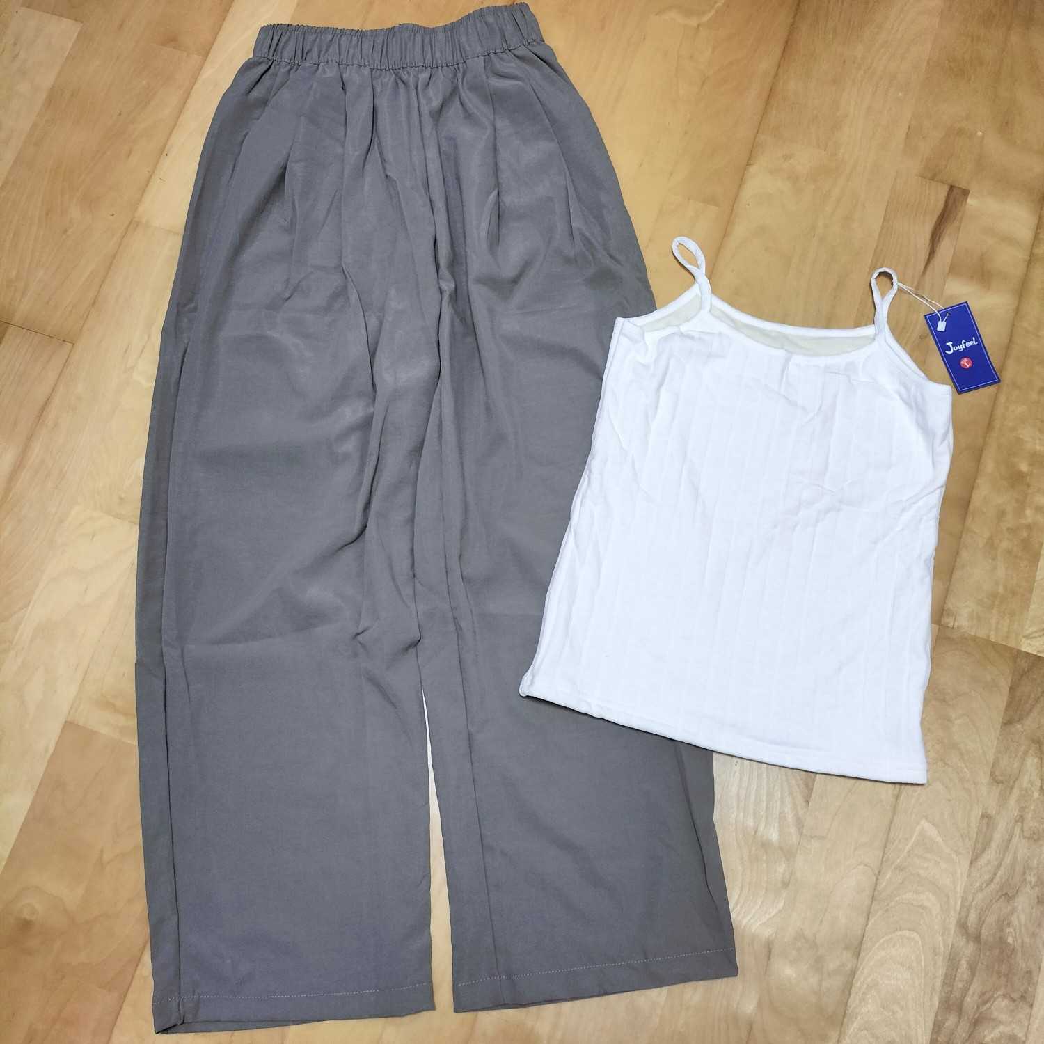 裏起毛のニットキャミと、とろみ素材のワイドパンツ。