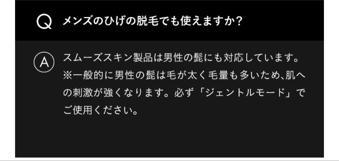お問い合わせいただきました件につきまして、男性のひげ脱毛にもご使用いただくことは可能でございます。しかしながら男性のひげにつきましては、体毛が太く毛量も多いため、痛み等肌への刺激が強くなることがございますのでご留意いただけますと幸いです。