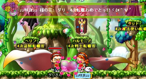 ダリ!4次転職おめでとぅ!!これからもヨロシク!愛してるよん♪っと叫ぶ予定でしたが、ダリの要望により拡声器は中止(・´ω`・)ショボーンこれからはIN率も悪くなっちゃうしひっそり辞めちゃうとの事゚(ノω・、)゚グスンとりあえず目標達成しちゃったし リアルを頑張んなきゃね。。。リアルが落ちついたらまた一緒にメイプルで逢って遊びましょうね昨日も1週間ぶりにダリルとカリカリ読めない本をドロする為に、牛さんの所で狩ってたらJrバルが居たとのダリ情報をキャッチ!Jrバルなんて どれ位ぶりだろう。。。随分と会って無かったですwこれでまた、しばらくJrバルとは会うことは無いでしょう。。。 昨日はおめでたい事がもう一つ咲良も140になりました(*´ー`*人)これが最後の大台になっちゃうかな。。。ということで、記念のお叫びをペタペタ。。。他にも叫んでくれた方や内緒、チャットありがとうございましたm(*-ω-)mこれからは、次の目標ジャクム兜を自分の手でGETすることかな?でも、最近欅もLvが上がってきたせいか、ジャクム待ちが非常に長くなってきてるみたいですね(;^_^A アセアセ・・・兜GETはいつになる事やら。。。