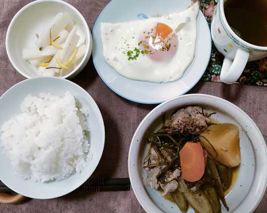 こんにちは^^今日は冷やっこい日です。手先の冷たさが気になります。温かく過ごしたいですね^^今日もよしりんの四毒抜き食事に挑戦です。今日のお昼は大根 牛蒡 人参 昆布 豚肉を煮込みました。味付けはかつお節 昆布からも出てくるであろうと想像して^^大根のレモン和え漬け玉子焼きご飯 となりました。今日も完食!ごちそう様でした<m(__)m>教室ブログはこちらでUPしています。ご来訪お待ちしています<m(__)m>