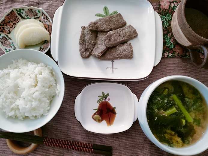 こんにちは^^今日もよしりんの四毒抜き食事に挑戦です。今日は も?^^大根の葉っぱ登場です。味噌汁にしました。わかめもたっぷり入れました^^牛肉を焼き焼きぬか漬けの大根ほっかほかのご飯です。今日も完食!満腹~^^ごちそうさまでした<m(__)m>
