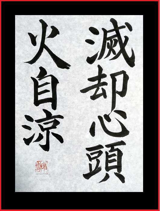 おはようございます^^本日もよろしくお願いします<m(__)m>昨日 息子も帰省してきました^^嬉しいです^^今年もたのしい年末年始がおくられそうです^^有難いことです。今年も残り少なくなってきましたがこの禅の言葉は年末大晦日まで書いていきたいと思っています。なにとぞよろしくお願いいたします。今日の禅の言葉は滅却心頭火自涼めっきゃくしんとうひじりょう「心を無にして煩悩を滅すれば、火の中ですら涼しく感じられる」という意味。どんな困難や苦痛も心の持ち方次第で乗り越えられるという禅の教え。三伏門閉一衲披兼松竹房廊蔭無安禅必山水須心中滅得火自涼さんぷくもんを とざして いちのうを ひすかねて しょうちくの ぼうろうを おおうなしあんぜんは かならずしも さんすいを もちいずしんちゅうを めつとくすれば ひも おのずからすずしこれが元の句だそうです。物事にこだわる分別執着の心(煩悩)「滅却」その心に煩わされたり、乱されたりすることがないこと今日も落ち着いて佳き日となりますよう祈っています。本日もありがとうございます<m(__)m>