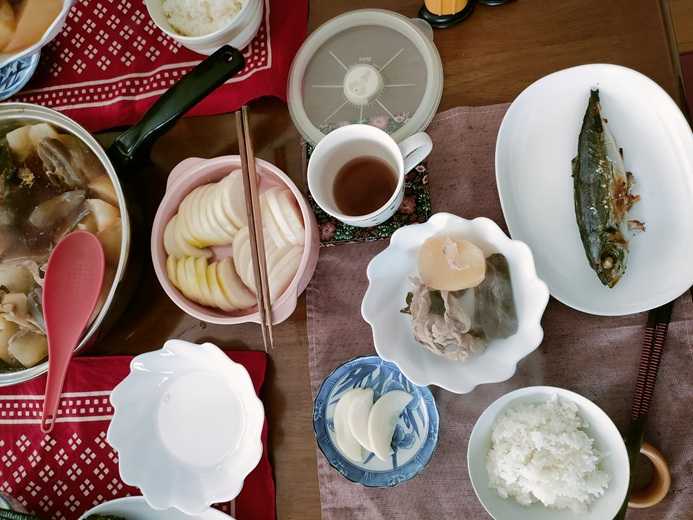 こんにちは^^今日も晴れ 気持ち良い日です^^今日はちょっと休憩気分。ほっこりゆっくりしています^^今日のお昼もよしりんの四毒抜き食事に挑戦です。今日は息子たちと鍋を囲みました^^大根 こんにゃく 豚肉 昆布で出汁を。ぬか漬けの大根鯵の塩焼きほっかほかのご飯です。今日も楽しく美味しくいただきました<m(__)m>毎日感謝です<m(__)m>
