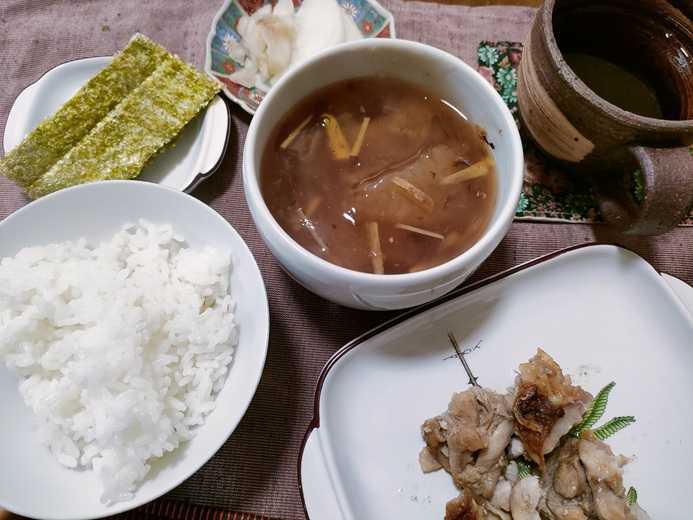 こんにちは^^教室が午前中にあったものだから今日は少し遅いお昼になりました^^なにをしよ・・・という時間もなく。。あそうだ!昨日と一緒でもいいや!!!~~~という気持ちでお昼です。今日もよしりんの四毒抜き食事に挑戦です。が昨日と同じ。。。あそうそう違ったことは冬瓜のお汁 今日は生姜と片栗粉でとろみをつけて濃厚にいただきました^^鶏のもも肉はこんがりと焼き上がり美味でございました^^今日は焼き海苔がプラスです^^今日も完食!満腹!ごちそうさまでした<m(__)m>