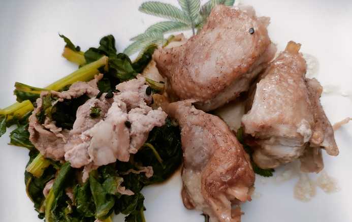 こんにちは^^今日のお昼!もち!よしりんの四毒抜き食事に挑戦です。今日は鶏肉のもも肉をピリ辛に焼いてみました。一味をプラスです。塩コショウと醤油と一味のみ。大根の葉はあっという間にしなれてくるので先日葉っぱ付の大根購入時に葉っぱだけ先に茹でておきました^^それを使って豚肉とからめてみました。味付けは コショウと醤油。冬瓜のお汁ぬか漬け大根ホッカホカご飯となりました。今日も満腹!完食!!!^^ごちそうさまでした<m(__)m>