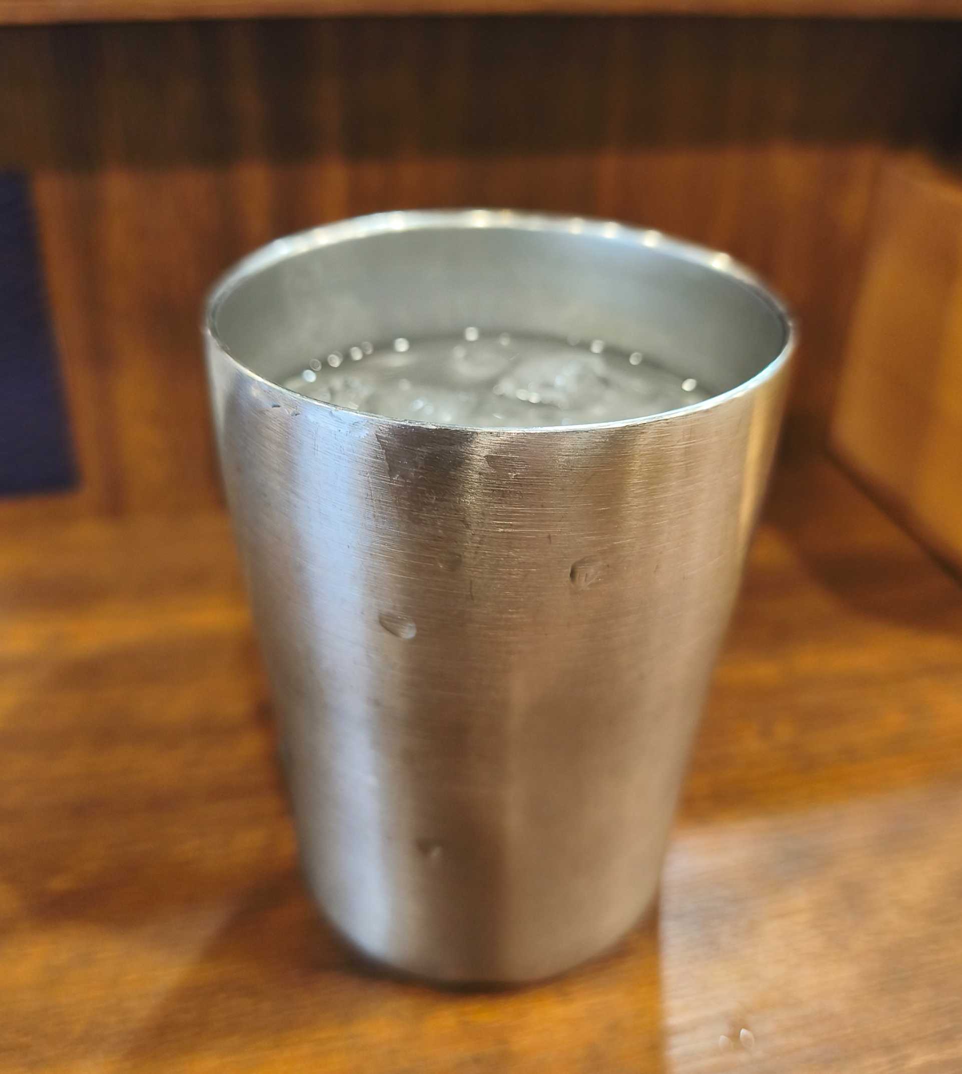 お冷はステンレスのカップ。これだと冷たいまましばらくキープできます。