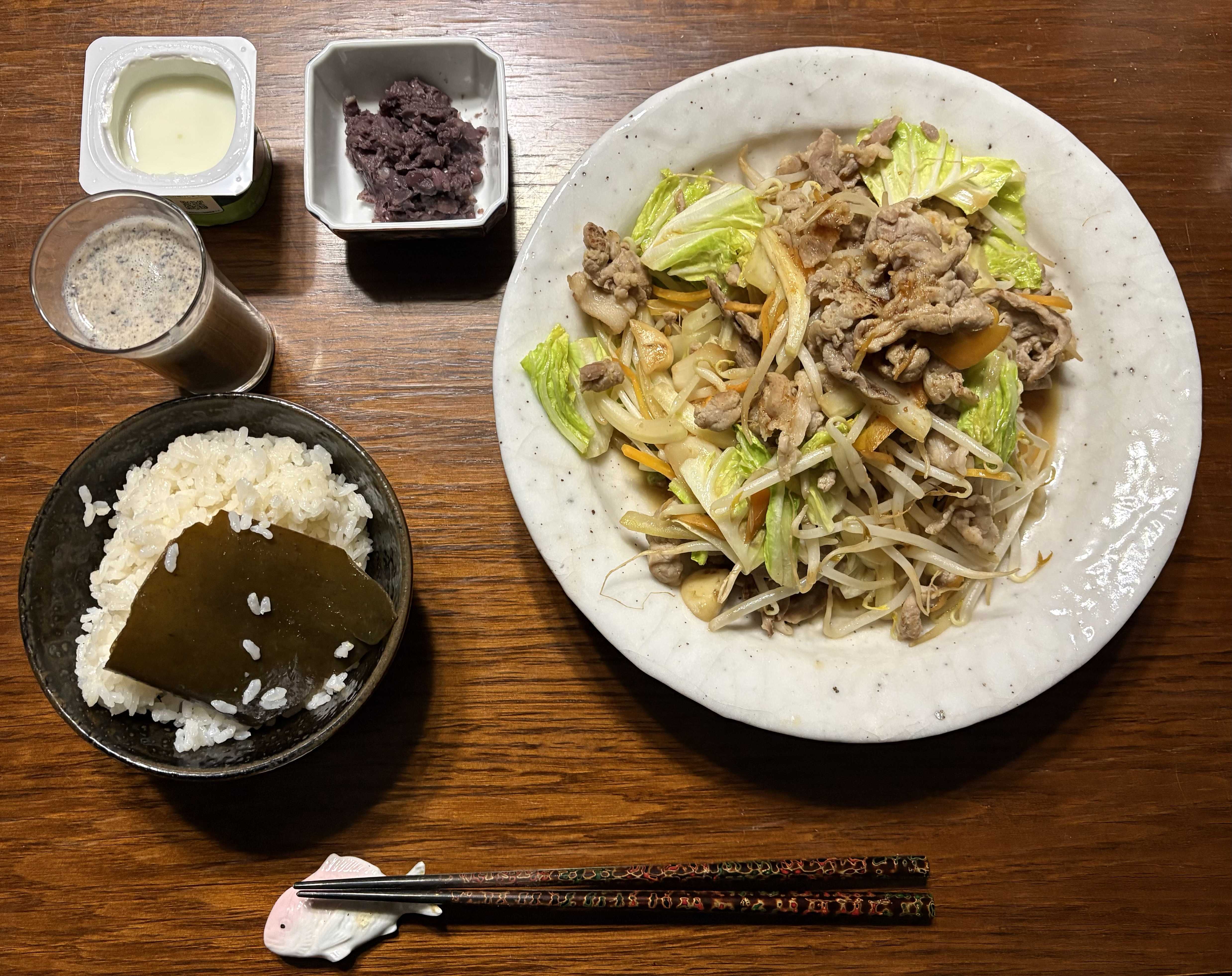今日の夕食 あきたこまち昆布炊き上げご飯、豚肉の野菜炒め、甘くな…