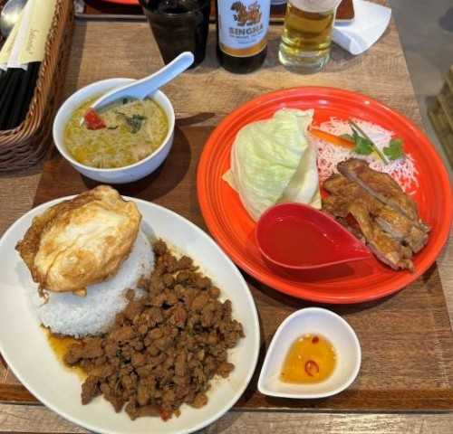 12月27日楽天ブログ読書コミックジャンルブログランキング10位でした。12月30日楽天ブログ読書コミックジャンルブログランキング10位でした。1月7日楽天ブログ読書コミックジャンルブログランキング8位でした。1月8日楽天ブログ読書コミックジャンルブログランキング9位でした。レイヤード久屋大通パークにあるタイ料理スコンターで食べました。ガパオライスランチ1320円+330円で選べるスープセット私はグリーンカレー、主人はトムヤムクンにしました。全てのランチにパリパリチキンのレタス包みレモンソースが付いてます。グリーンカレー大好きなので、ガパオライスと両方食べれるって嬉しいです。ビアシンハー682円も美味しかったです。