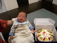 台湾の風習で生後1ヶ月を盛大に祝います。 台湾では第1子が生まれて1カ月(満月と言ったり彌月と言ったりする)するとお祝いをする。男の子の場合は油飯と呼ばれるご飯(名前通りちまきのご飯のように油っぽい。ご飯だけでなく、鶏肉やイカも入っているので見た目は結構怖いかも)を親しい人に贈り、女の子の場合はケーキを贈るのが慣わしだが、最近はもっぱらケーキが多いそう。これらの贈り物はセブンイレブン(!)などでもカタログがある位にメジャーな行事である。そして贈り物だけではなく、レストランで人を招いて食事をご馳走したりもするのだ。goo世界なんでも子育て事情より今回用意した油飯はなんと25kg!これを知り合いやお祝いをいただいた人に配りました。食事はうちで、レストランよりテイクアウトしたものが並び、夫の実家のメンバーやごく親しい11人が集合しました。お祝いにケーキを用意しました。私が食べたいだけ?!ところが一番ケーキを喜んだのは、他でもない優介、だったりしました。「ハパーバースデーーツーユー♪」大声で歌い、大盛り上がりの優介。優徹の迷惑そうな顔が印象的でした。しかし、盛り上がりとは裏腹に、ろうそくを「ふー」した後は、ケーキには興味なし。中のフルーツをのみを食べて、嵐のように去っていく、長男優介。この傍若無人の兄とは裏腹に、眠り続ける大物優徹。面白い兄弟になりそう。