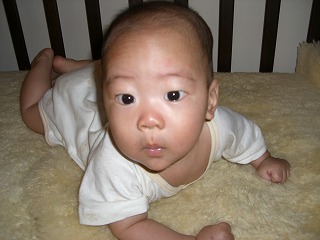 今日で、優徹は4ヶ月です。☆-(ノ゚Д゚)八(゚Д゚ )ノイエーイ得意の首すわりのポーズもきまっています。驚いたことに、なんと寝返りをするんです。はじめは機嫌が悪かったらしく、えびぞりをして、手をばたばたさせていたところで、偶然にも、ころん。その瞬間は私は目撃できず、夫が、「おーい、優徹が寝返ったぞ。」まさか、と思ったのですが、夫はすでに2回も目撃していました。ただの偶然だと思っていたのです。ところが、優徹の隣にぬいぐるみを置いて、洗濯物をたたんでいたら、えびぞりをしてぬいぐるみのほうに行こうとしています。そして、ギャーンと一声泣いたと思ったら、コロン。転がっていたのです。Σ(゚Д゚ υ)開いた口がふさがらないほどびっくりしました。寝返ったときに手が下敷きになって、上手にぬけないこともありますが、一日に2回くらい寝返りの成功を目撃しています。やはり、兄ちゃんの攻撃からいち早く逃げようと、優徹なりにあせっているのではと思わずにいれません。
