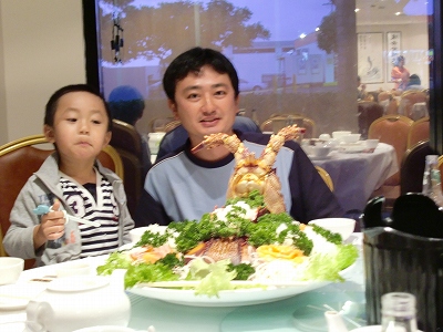 あいにくのお天気のブリスベン。けんちゃんが雨を持ってきたかのように本格的に降っています。こうなったら、出かけるところがないのがブリスベン。晴れていれば、最高。雨が降れば自宅軟禁です。そんなこと、2匹の興奮したお猿さん化した優介&優徹が許してくれるはずがなく、朝から、走り回り、けんちゃんの後を追い掛け回し、トイレも行かせず遊んでもらうほどのお祭り騒ぎになっていました。これじゃあ、かわいそう…。姉ながら、救済策として、近所のショッピングセンターへブラブラを決行。まず、子供たちを納得させるために、ゲームセンターに行きました。しばらく遊ぶと喜ぶんです。お金を使ってゲームで遊ばせなくっても、レーシングゲームのハンドルを握ったり、スイッチを押したりするだけで十分のようです。一応、ボーリングなどで遊び、チャチな景品と交換して子供は大満足。ショッピングセンターを一周して、けんちゃんはお昼に好物のケバブを購入。優介と優徹、私はハングリージャック。家に戻り昼食。かなり大きいケバブなのにペロッと食べてしまうけんちゃんに唖然。 (゚Д゚;)お主、後悔するぞ、そんなデカイものを食べると。一応、忠告。そう、今晩は義父主催の「けんちゃん歓迎会」場所はいつもの香格里拉。でますよ、あの巨大○○。デ━━━━━━(≧∀≦)ノ━━━━━━ タ !!!!! 義父名物巨大伊勢海老。義父が歓迎会を催すと必ずこれ。今晩は3kg級でしょう。けんちゃん。(゚Д゚;∬アワワ・・・ちょっと、気持ち悪いくらいデカイ。優徹なんて、「あ、クロロダイル(鰐)!」うん。小型の鰐くらいあります。刺身でいただいて、その後、麺と炒めて再び出現。そして、日本では高級品の北京ダックも登場。けんちゃん、うはうは言いながら食べていました。きっと、「また来よう。甥っ子たちの面倒を見るのはたしかに大変だけど、このごちそう食べれるなら、また来よう。」そう思ったに違いありません。テーブルでは英語でがんばっていたけんちゃん。随分上手になりました。感心、感心。 優徹が途中、おうち帰ると言わなかったのもびっくり。楽しい食事会でした。