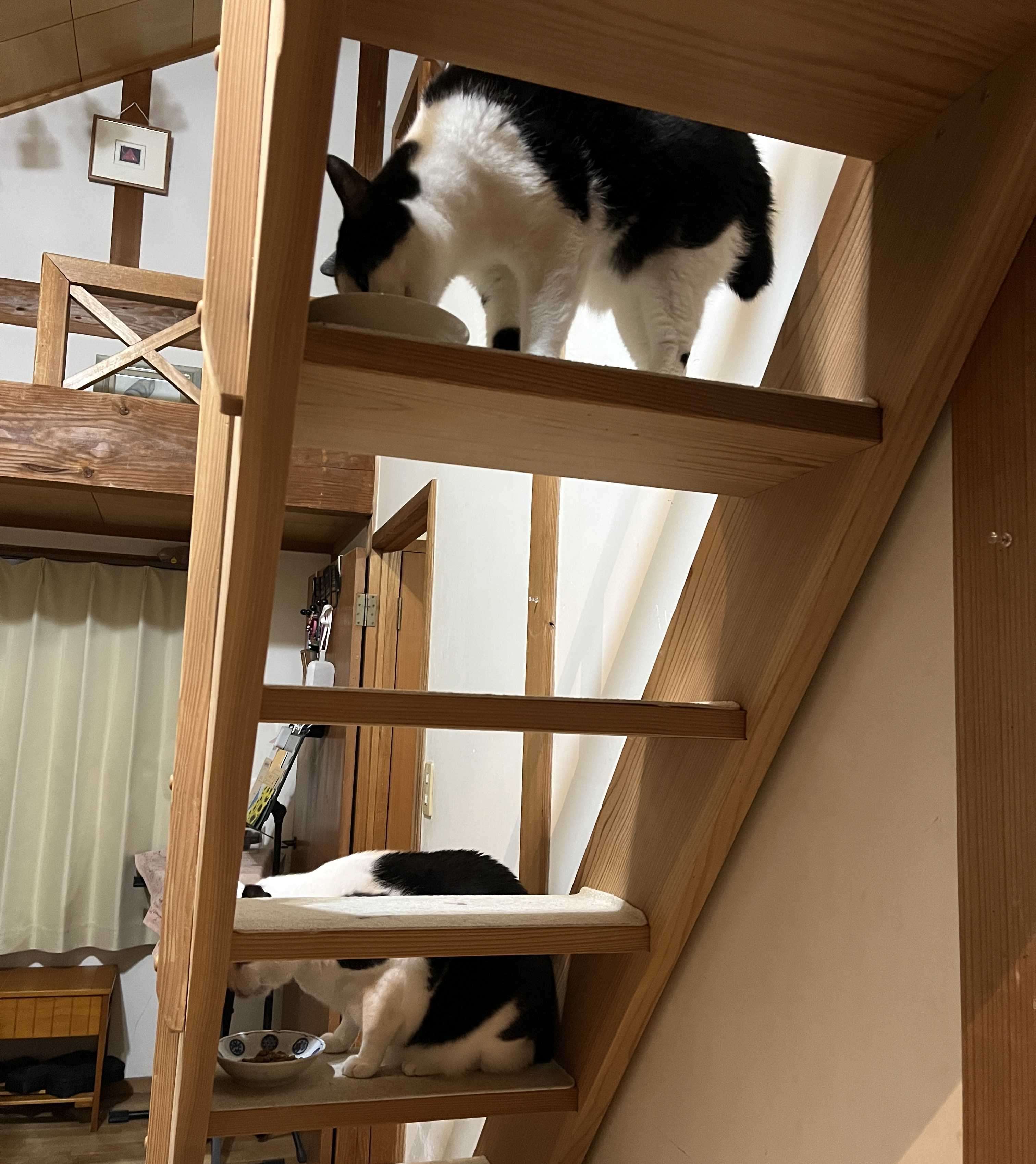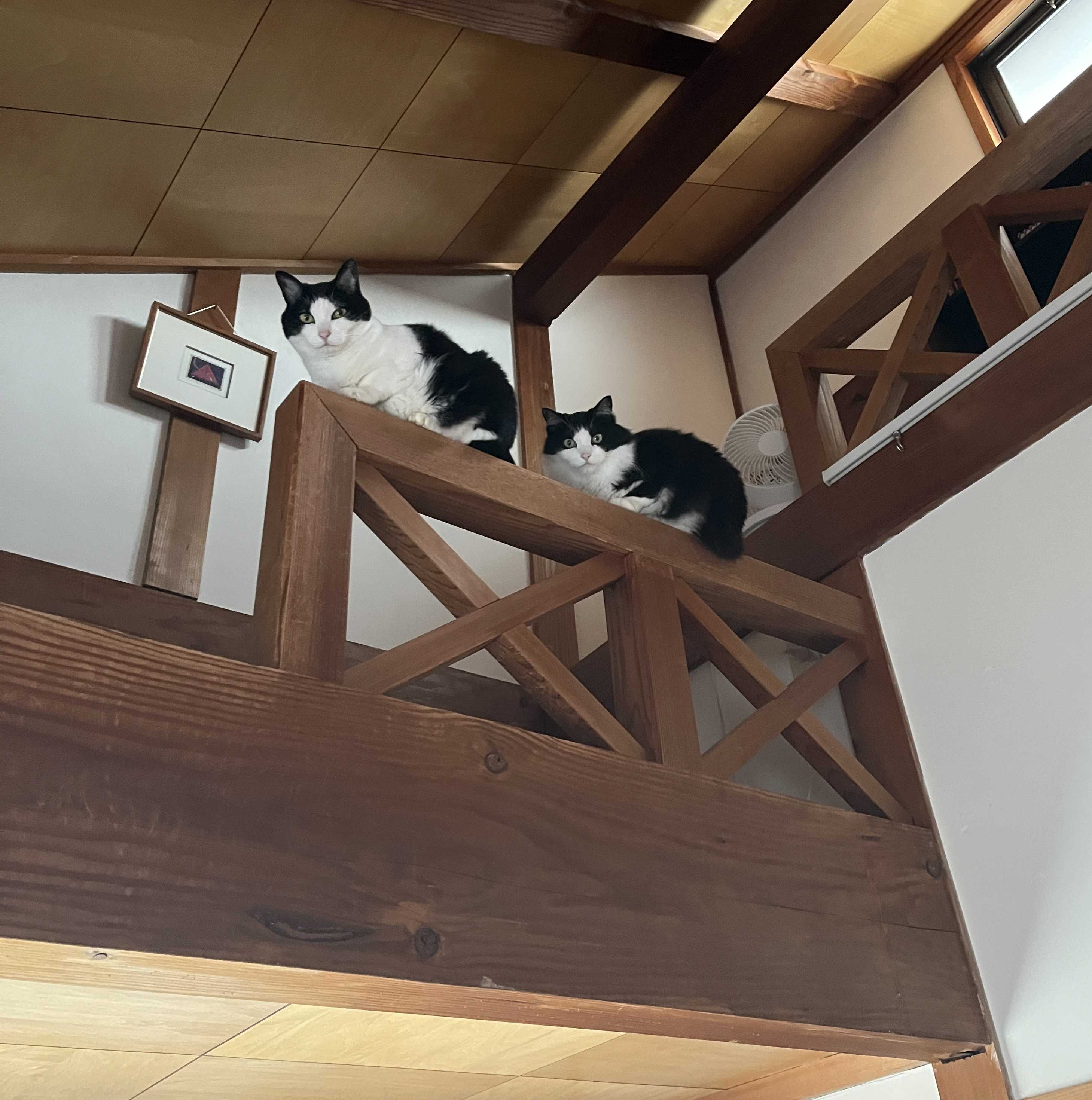 朝の手摺りミキあに。猫はいいね、バランス感覚抜群やね♪うらやましいですよ*~(´・ω・`)~*そういえば以前は、ここに梯子を掛けて上っていたんだったな…と思い出した。そして梯子から落ちて全治何ヶ月だったっけ…あれは2018年の春だったかしら。それでやっと階段作ってもらえて…だけどはなをが亡くなった後だったもんね、はなをに階段を上らせてあげたかったなぁ、それが心残りのひとつ。毎日、突然のように階段を上り下りしつつロフトのドームベッドで寛ぐおふたり。いいかい、キミたちは恵まれているのですよ。初めから階段が存在したのですから!階段を勝ち取る為に私が文字通り骨を折って(厳密にはヒビだけど)頑張ったのよ!私が身体を張って勝ち取った階段なのよ!…と猫たちに自慢する夕暮れ。