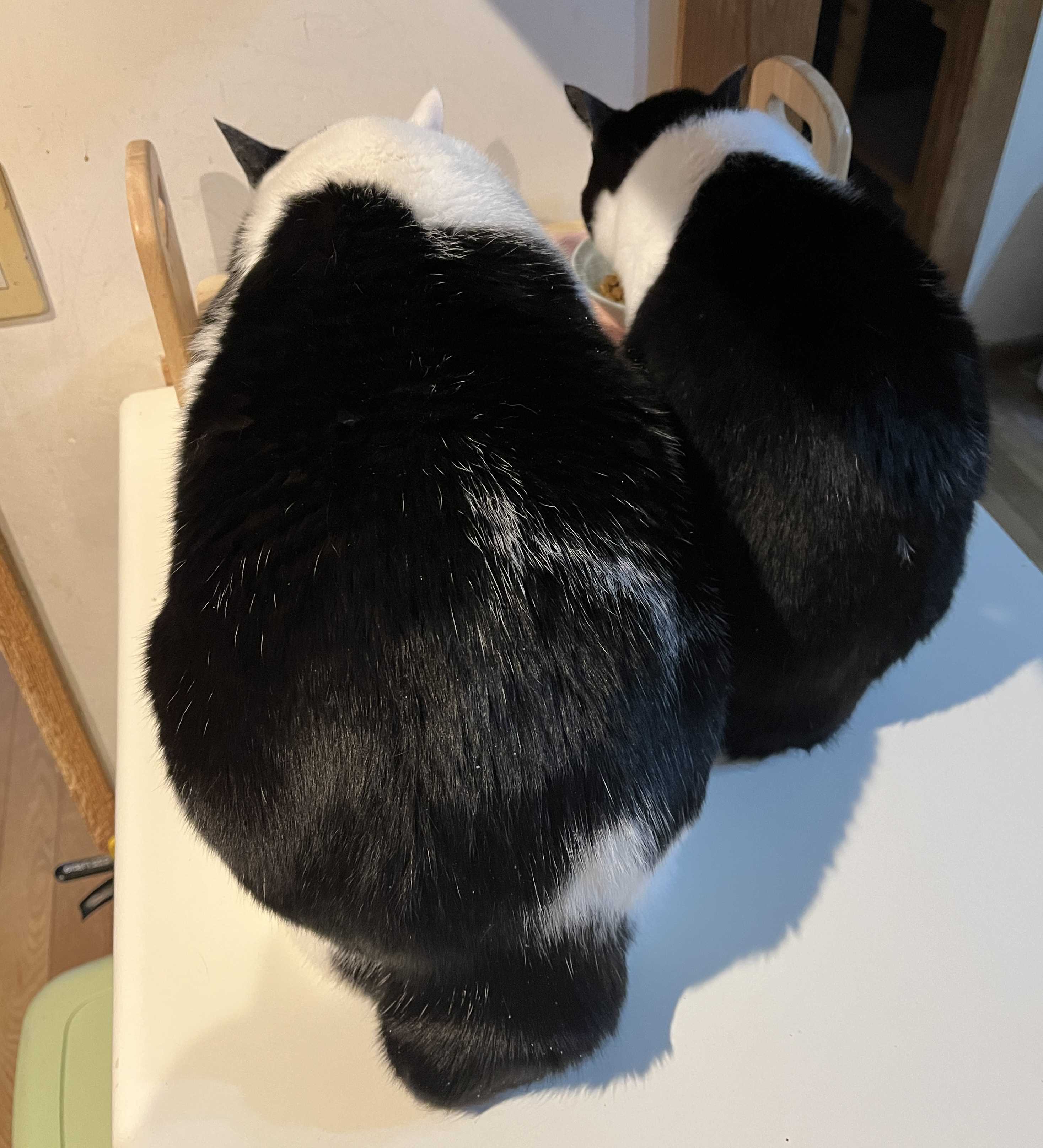 久しぶりに並んで朝ゴハンかな。あにてる。9kgと3kgが並ぶ朝。てるの目標体重は8.5kgだから、ちょっとずつ、ちょっとずつ、時間をかけて減らしてゆこうね。おいしいかい?ミキは今朝は吐き戻しなかったね、よかった。ヨシヨシだよ。苦悶の表情に見えるけど、スヤスヤ寝ているだけ。やっぱり、あにって写真の撮り方が難しい気がするの何で?