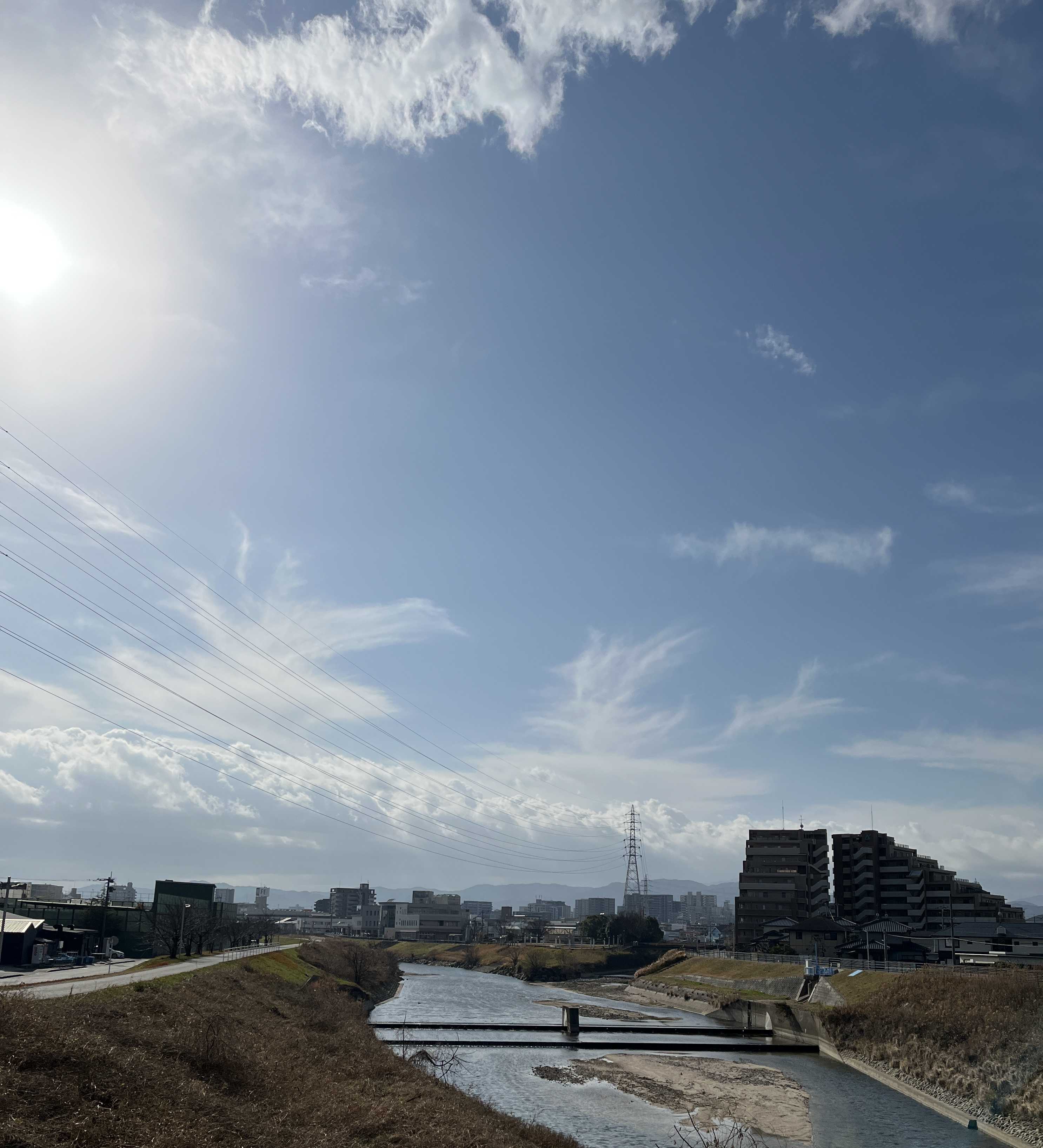 月一、喘息の病院へ。今日の空は雲が綺麗だったんだなと、今、撮った写真を見直して気付いた。だって、とにかく、風が強くて…晴れた空と、波打つ川を撮るので精一杯だったの。風、強かったなー。