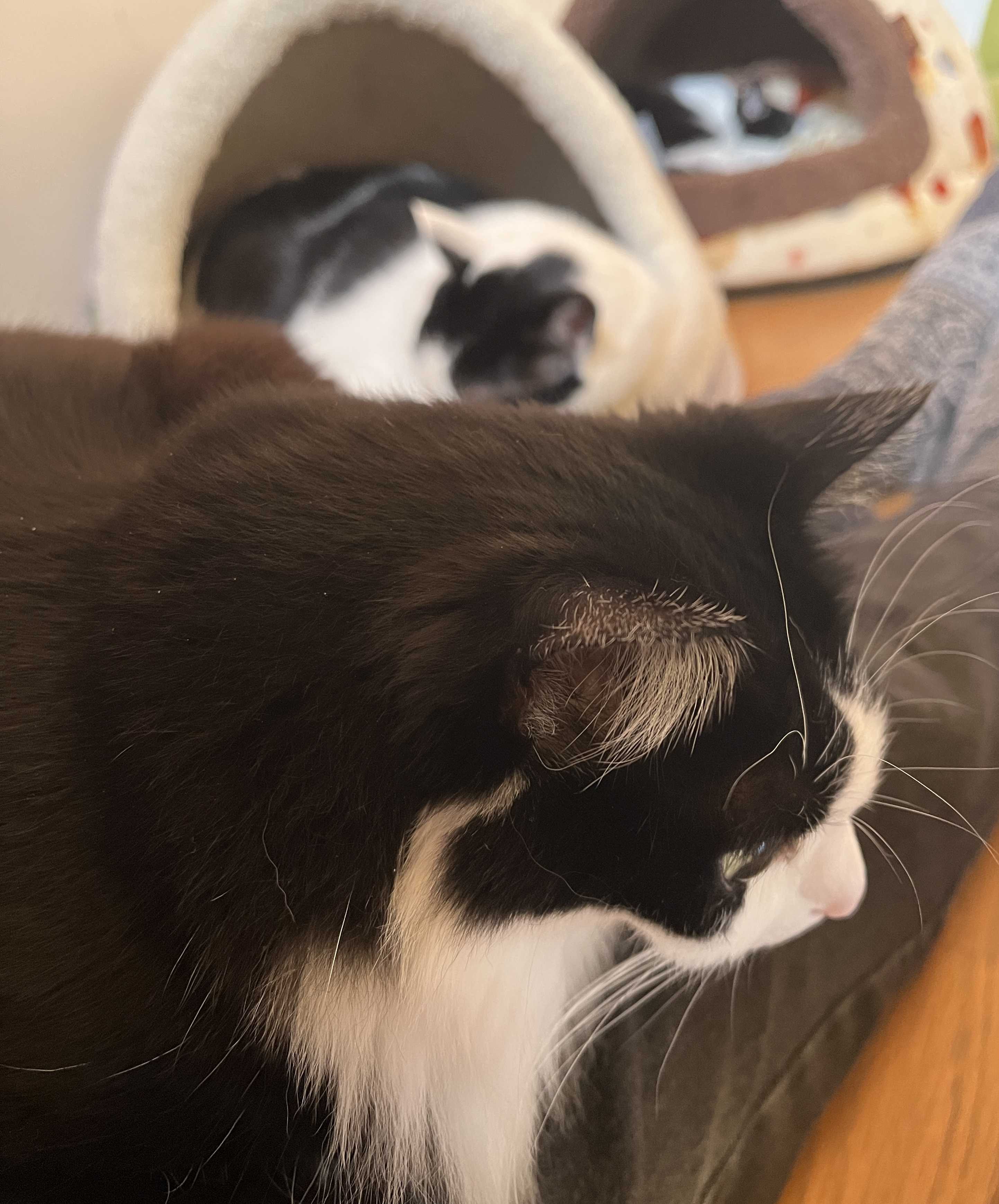 20時過ぎ、今日の写真を一枚も撮っていない事に気付き、てるを撮る。明日を見つめる凛々しい感じで。するとミキがやって来てお膝タイムを始めたので撮る。今日も、曇りなきまなこですね。棚の最上段に上っていたあにが、降りて来てトランポリンにちょこんと。あにも写りに来てくれたのかな?アニノセナカ ミテ。うん、まあるいね。よしよし。今日は祝日、何の日だったか…パッと思い出せないな…あっ建国記念日だ、多分そうだ!…という感じで、記憶があやふやになりがちな昨今。明日は病院、午後はレッスン。何となく、何かをやりかけて忘れているような…何だっけ。