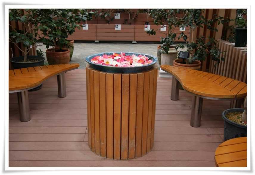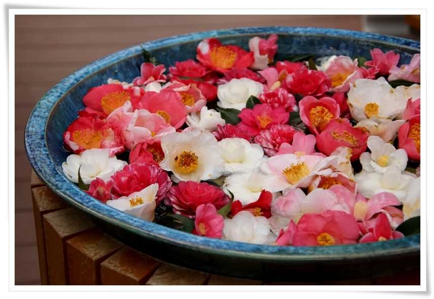 水盤の上にはいろんな椿の花が浮かべられています