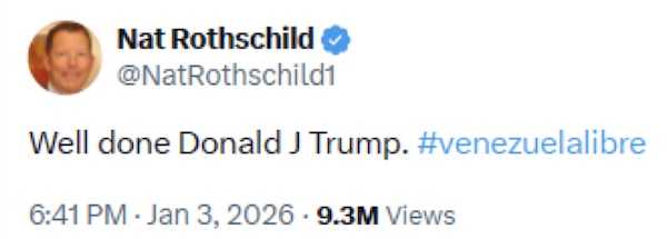 世界有数の富豪、ナット・ロスチャイルドは1月3日にベネズエラでの出来事について、「よくやった、ドナルド・J・トランプ」とX(Twitterから名称変更)に書き込んだ。 この日、アメリカ軍の特殊部隊デルタ・フォースがベネズエラのニコラス・マドゥロ大統領夫妻を誘拐したのだが、政権が崩壊してマリア・コロナ・マチャドが大統領に就任するようには見えない。 マチャドは昨年11月、マイアミで開かれたアメリカ・ビジネス・フォーラムのイベントにリモートで登場、ベネズエラからマドゥロ大統領を排除すれば、1兆7000億ドルの投資機会がアメリカの巨大企業へもたらされると主張していたが、現状では同国の石油をアメリカが支配できそうにない。 アメリカを含むNATO諸国は2013年11月から14年2月にかけてキエフでのクーデターを仕掛け、ビクトル・ヤヌコビッチ政権を倒すことに成功したものの、その結果としてヨーロッパ諸国は安価な天然ガスの供給源、そして製品を売るマーケットを失い、経済は破綻した。短期間のうちにロシアとの戦争で勝利し、同国の石油利権を奪うという皮算用をしていたのだろうが、ウクライナでの戦争で彼らはロシアに敗れた。そうした状況の欧米諸国にとってベネズエラの石油は魅力的なはずだ。 アメリカ政府が11月16日に空母ジェラルド・R・フォードを含む艦船をカリブ海へ派遣し、閉鎖されていたプエルトリコの海軍基地を修復して使えるようにした当時はベネズエラの石油を奪おうとしていたのかもしれないが、艦隊がカリブ海へ入る前、10月下旬にロシアのアヴィアコン・ジトトランス所属のIl-76TD輸送機がベネズエラに飛来、ベネズエラ沖にロシアの艦船が配置されて状況は変わった。 11月上旬にはアメリカ軍は2機のB-52爆撃機をベネズエラへ向けて飛行させたが、この時、爆撃機は陸地から約100キロメートルの地点でロシア製防空システムであるS-300に照準を合わされ、基地へ引き返している。ベネズエラは中低高度の防空システムであるブークM2e、シリアで有効性が証明された近距離対空防御システムのパンツィリ-S1も配備したとされている。アメリカ軍は身動きが取れない状況になったが、1月3日にアメリカ軍が誘拐作戦を実行した際、こうした防空システムは機能しなかった。 また、マドゥロ大統領は1月2日遅くに中国のラテン・アメリカ担当特別代表の邱小琪と会談、中国とベネズエラの戦略的関係を再確認していたとされているが、マリオットホテルに泊まっていたCNP(中国石油天然気集団)幹部のリー・ウェイをその前にベネズエラの情報機関が拘束し、連行したとする未確認情報があるが、あくまでも未確認であり、事実でない可能性もある。 その一方、マドゥロは元CIA工作員だとする情報も流れている。1月3日の作戦は彼を救出することが目的だったというのだ。マドゥロはベネズエラをアメリカから独立させたウゴ・チャベスが大統領だった時代の副大統領ではあるが、少なくとも途中から「同志」とは言えなかったと言われている。つまり、今でもベネズエラの多数派であるチャベス支持者とマドゥロとの関係は微妙だった。 本ブログでも繰り返し書いてきたことだが、世界の麻薬取引を仕切っているのはCIAであり、コカインはラテン・アメリカから北アメリカやヨーロッパへ流れている。おそらくフリードリヒ・メルツ独首相、エマニュエル・マクロン仏大統領、そしてハンター・バイデンも顧客だが、ベネズエラは主な流通ルートには含まれていない。「ロス・ソレスカルテル」などは存在しない。大半はコロンビアから中央アメリカを経由してマーケットへ運ばれる。 マドゥロ大統領の下、ベネズエラでは石油インフラが再建されず、物価の上昇は深刻で、食料の確保も困難な状態になっていた。しかも彼は経済の私有化を進めて経済格差を拡大させ、カジノを設立している。その結果、チャベス支持者との関係は悪化していく。そのチャベス支持者は革命指導者ホルヘ・アントニオ・ロドリゲスの娘、デルシー・ロドリゲスを支持しているようだ。彼女はチャベスに信頼されていたという。 真相は不明だが、1月3日の誘拐事件は奇妙な印象を拭えない。**************************************************【Sakurai’s Substack】【櫻井ジャーナル(note)】