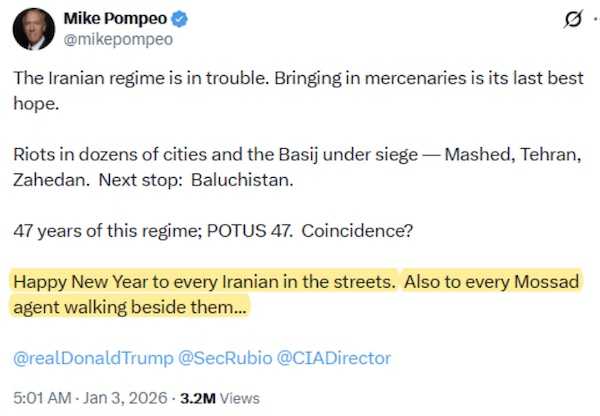 西側の大手メディアはイランの状況について「自由と民主主義を求める人民が決起した」と宣伝しているが、その背後ではCIAやモサドが暗躍していた可能性が高い。西側諸国による経済攻撃によってイランの経済状況は厳しく、人びとの怒りや不満は高まっていて、そうした怒りや不満を利用して引き起こされたと言うべきだろう。 イスラエルのベンヤミン・ネタニヤフ首相とドナルド・トランプ米大統領がアメリカのフロリダ州にある「マール・ア・ラーゴ」で会談したタイミングでデモが始まったのだが、これを偶然で片付けることはできない。 数百人から数千人の死傷者が出ていると伝えられているが、デモ参加者がショットガンを上空に向けて発砲、あるいは治安部隊の隊員を殴り殺したり焼き殺したりする様子を撮影したという映像も流され、体制を支持する大規模なデモの情景も伝えられている。治安部隊の隊員や市民がデモ隊に殺される状況になったことから政府側の反撃は厳しくなり、暴力的な抗議活動の首謀者とされる者たちを公開処刑すると当局は発表した。 アメリカのCIA、イギリスのMI6、あるいはイスラエルのモサドのような情報機関はさまざまな国の労働組合や政治団体にエージェントを潜り込ませて乗っ取り、操ってきた。1950年代にCIAはイランやグアテマラの政権をクーデターで倒し、巨大資本のカネ儲けに協力したが、その時もそうした組織を利用して反政府でもを仕掛けている。いずれも政府が暴力的な衝突を避けようとしたことからクーデターは成功、両国の状況は悲惨なことになった。2014年のウクライナも似たような展開で、内戦になり、その後NATOとロシアの戦いになった。 1961年4月にアメリカ軍やCIAの好戦派は亡命キューバ人を利用し、キューバへの軍事侵攻を試みた。「ピッグス湾(プラヤ・ギロン)上陸作戦」だ。アレン・ダレスたち軍事侵攻を計画したグループは、作戦が成功する可能性が小さいと考えていた。そこでアメリカ軍を「救援」の名目でキューバへ軍事侵攻させようと目論んでいたようだ。(Lucien S. Vandenbroucke, "The 'Confessions' of Allen Dulles: New Evidence on the Bay of Pigs," Fall 1984) 侵攻部隊の敗北が明らかになると、チャールズ・キャベルCIA副長官は航空母艦からアメリカ軍の戦闘機を出撃させようと大統領に進言したが、アメリカ軍が前面に出た侵攻作戦の要求は却下された。(L. Fletcher Prouty, "JFK," Citadel Press, 1996) テキサス大学のジェームズ・ガルブレイス教授(経済学者ジョン・ケネス・ガルブレイスの息子)によると、ピッグス湾上陸作戦に失敗した直後の1961年7月、統合参謀本部のライマン・レムニッツァー議長、SAC(戦略空軍)のカーティス・ルメイ司令官、あるいはアレン・ダレスCIA長官などは、大統領に就任して半年のジョン・F・ケネディ大統領に対してロシアに対する先制核攻撃計画について説明している。 この好戦的なグループは1963年の後半にソ連を先制核攻撃しようと計画していた。その頃になれば、アメリカはソ連を先制攻撃するために必要なICBMを準備でき、ソ連はICBMを準備できていないと信じていたからだ。その計画を承認しなかったケネディ大統領は1963年11月22日にテキサス州ダラスで暗殺された。 イランでもトランプ政権はイランの反体制派を支援するという口実で軍事介入すると考えている人もいるが、イラン周辺にあるアメリカ軍の基地で防衛態勢を強化したり、撤退する動きが見られないことから、トランプ大統領に軍事介入をする意思は今のところないようだ。 現在のイスラム体制が崩壊した場合、自分が受け皿になると主張しているクロシュ・レザ・パーレビは1979年までシャーを名乗り、腐敗、政治弾圧、拷問で悪名高いモハマド・レザ・パーレビの息子。モハマド時代のイランはイスラエルの影響下にあったが、クロシュは2023年にイスラエルを公式訪問、イスラエルとの関係は深い。この人物は「民主化運動家」でも「人権活動家」でもなく、アメリカ、イギリス、そしてイスラエルの手先にすぎない。 このクロシュ・レザ・パーレビを売り出すためだけでなく、イランを不安定化させるため、数十の偽アカウントを利用し、AIによって生成されたコンテンツを拡散した。「ハメネイに死を」や「独裁者に死を」と叫ぶようにも呼びかけているのだが、これらのアカウントはイスラエル政府またはその代理業者によって運営されている可能性が高いという。**********************************************【Sakurai’s Substack】【櫻井ジャーナル(note)】